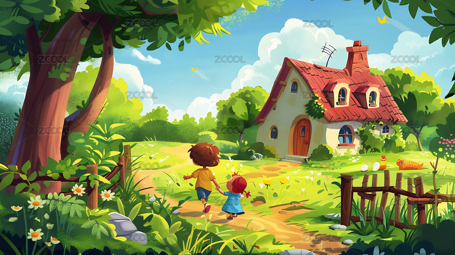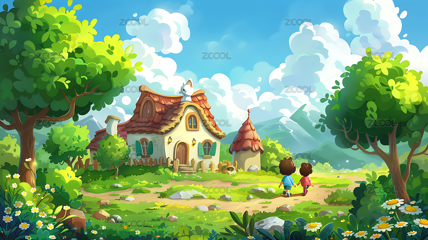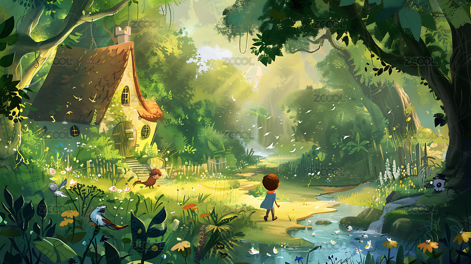 夏天草地上跳舞的小兔子、小松鼠和小熊