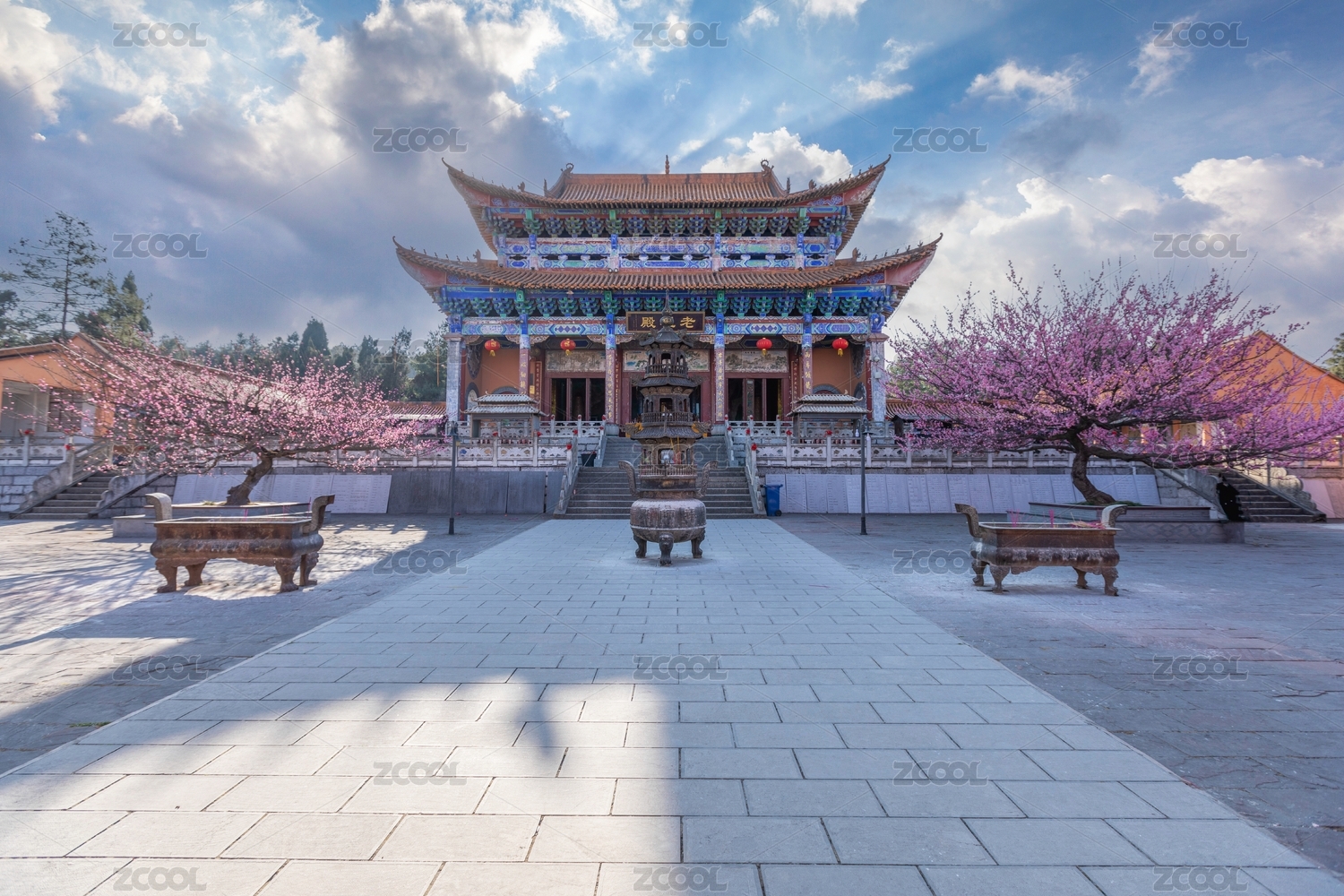 昆明棋盘山棋盘宫蓝天白云衬托古树梅花盛开