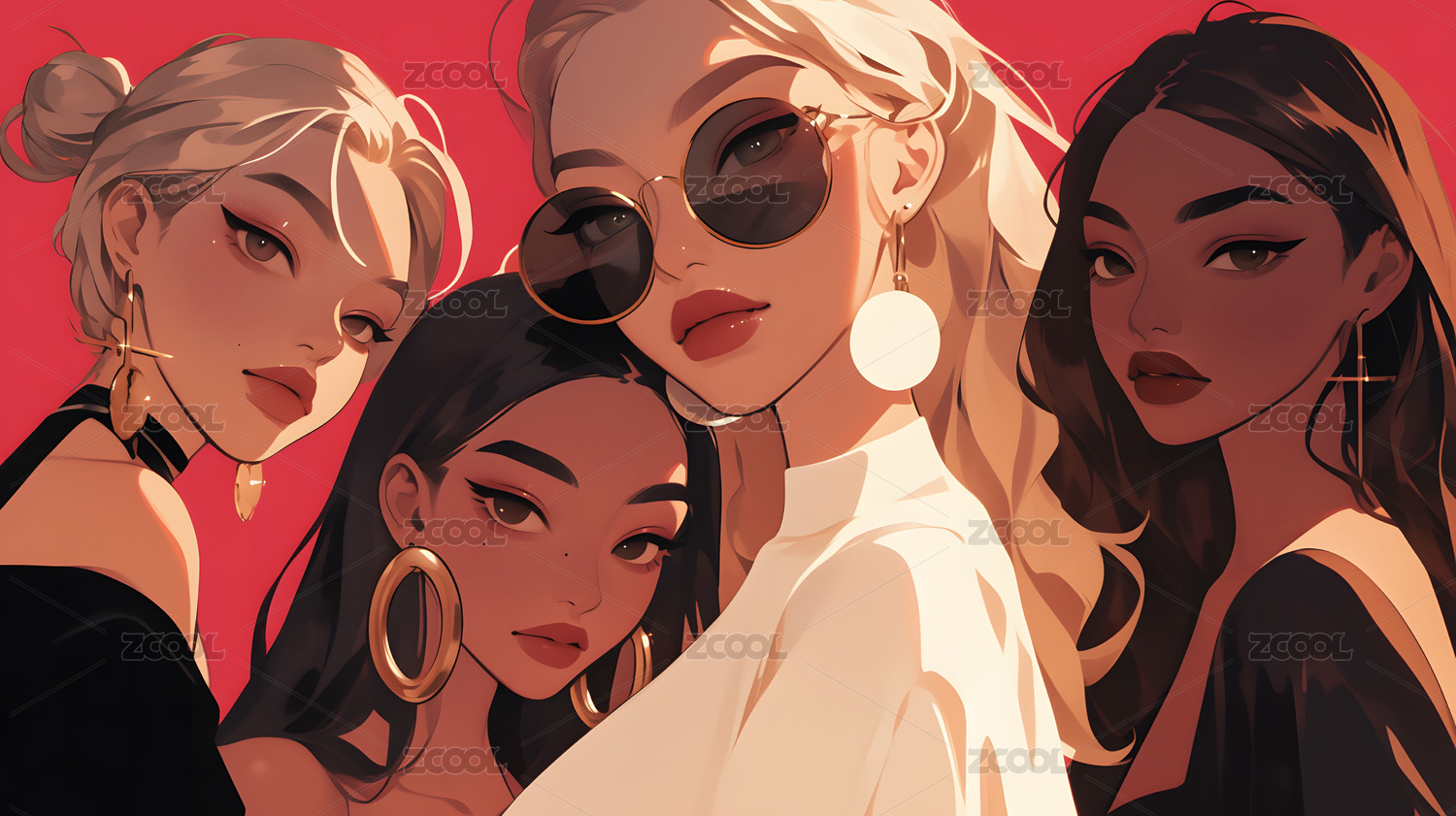 一群不同皮肤不同种族女模特展示服装插画秀