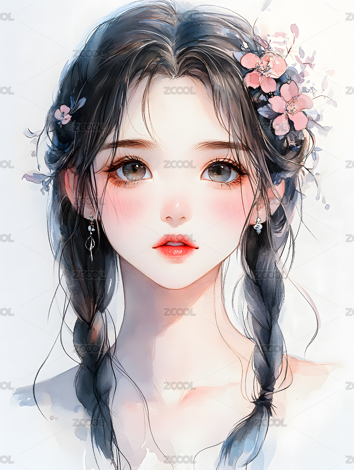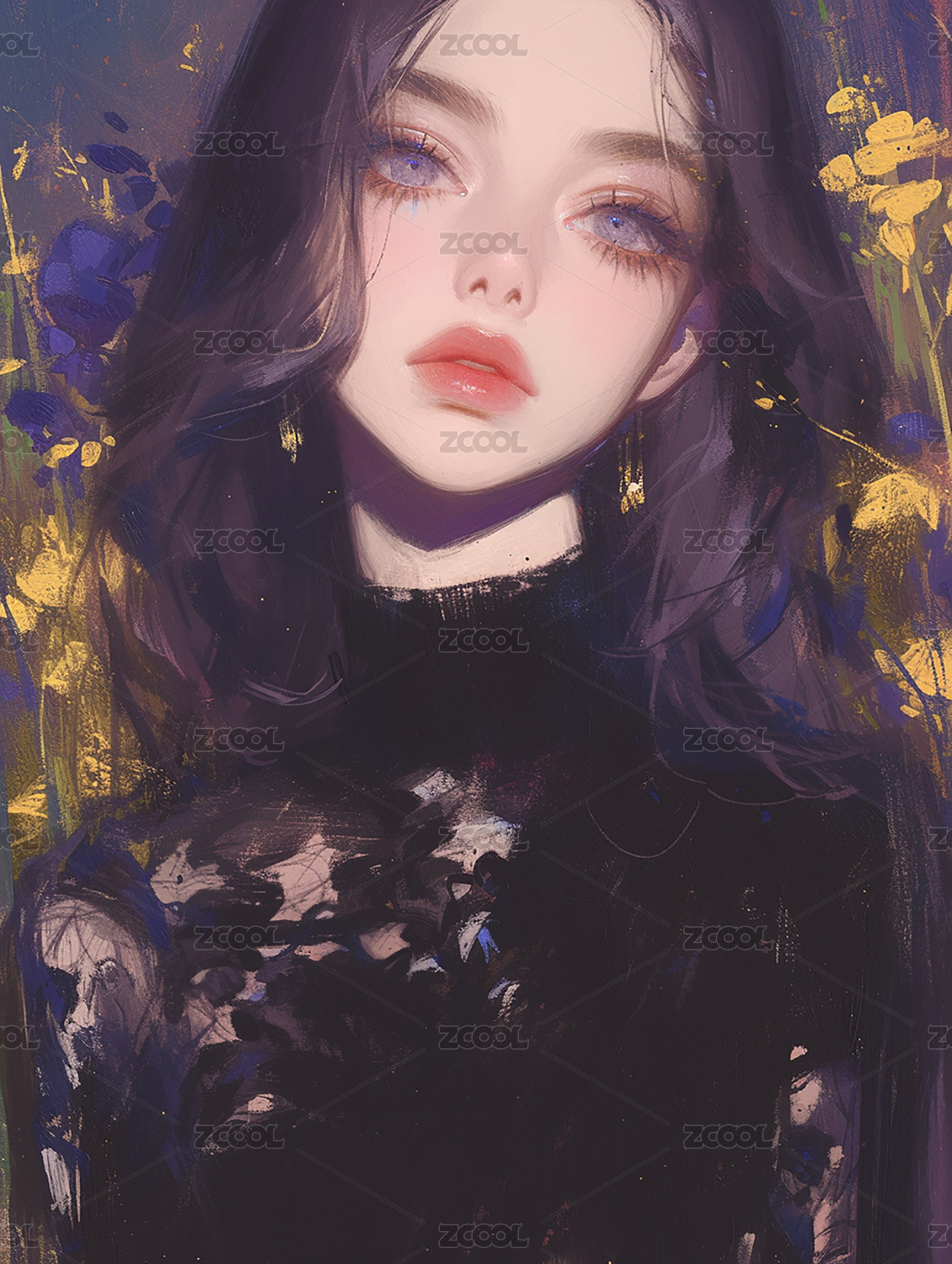 紫色长发穿紫色衣服的女孩有美丽花朵的背景