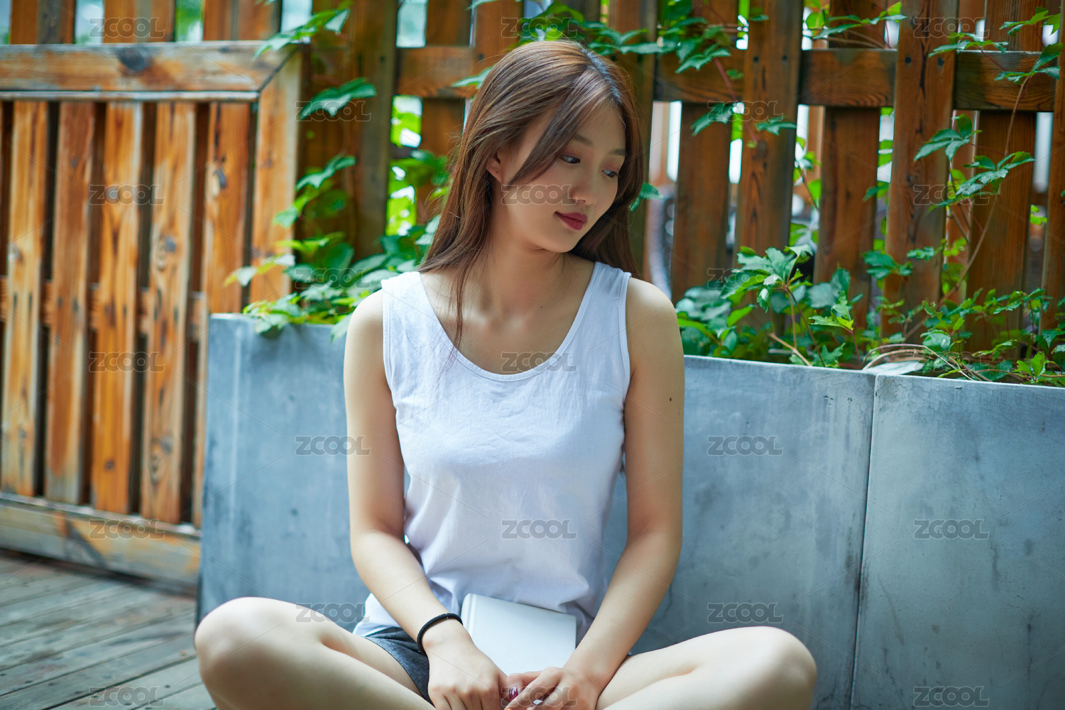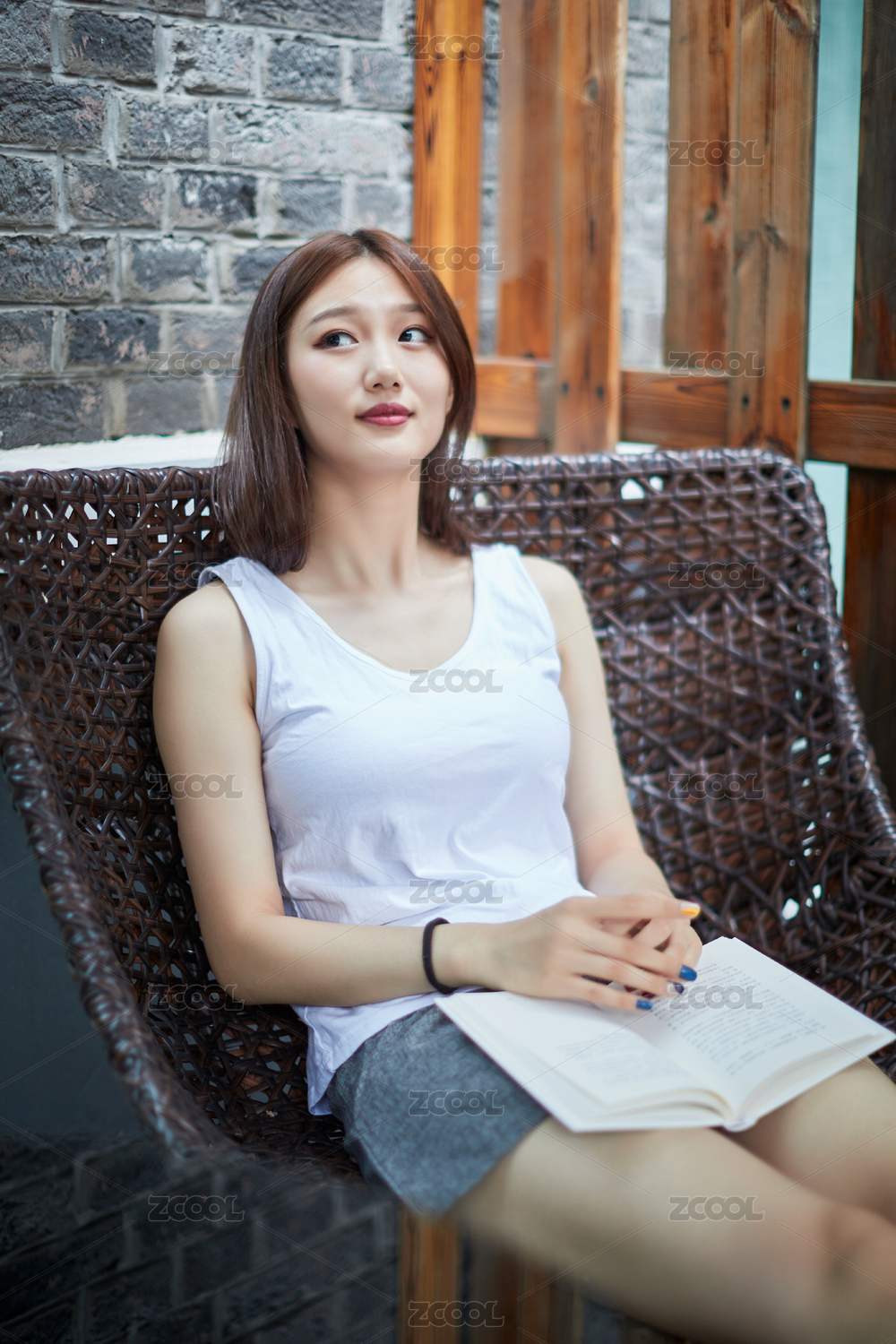 夏日院子里坐在藤椅上手捧书籍的亚洲美少女