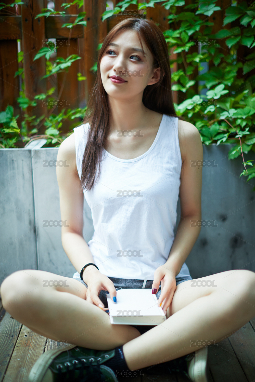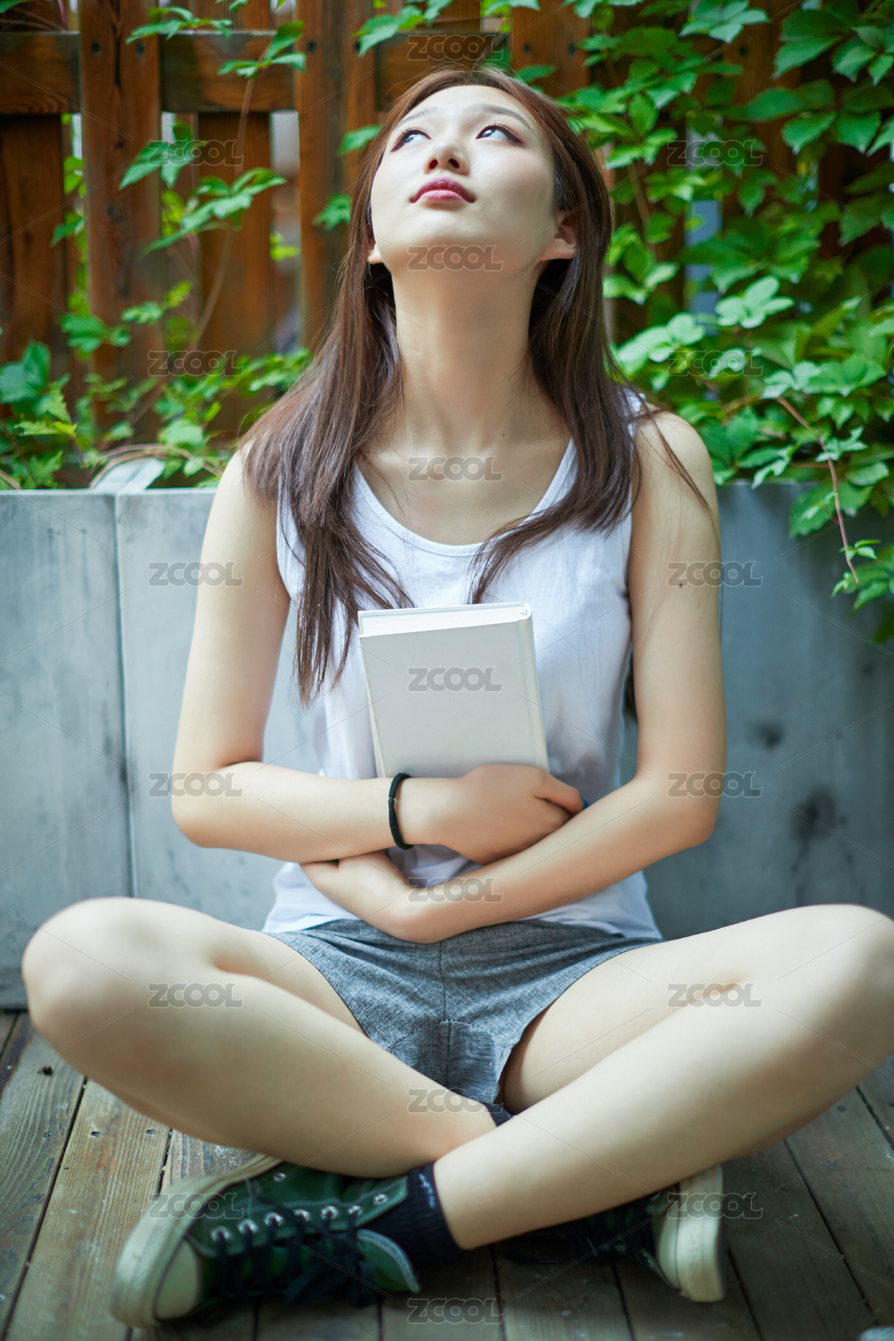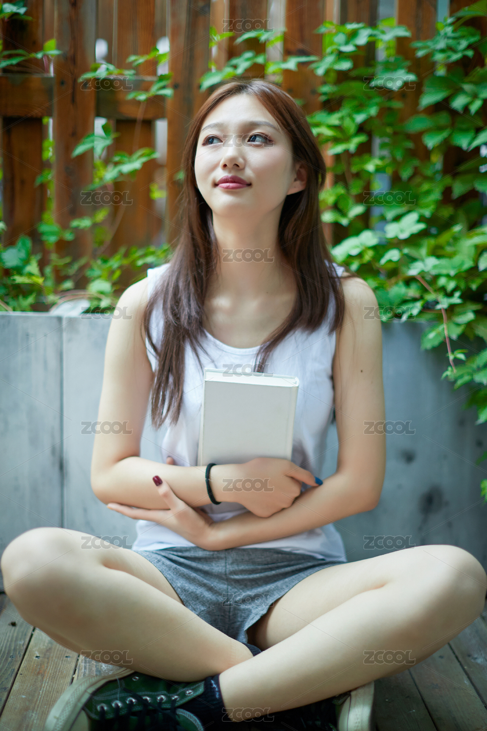清新夏日坐在院子里手拿书籍阅读的可少女