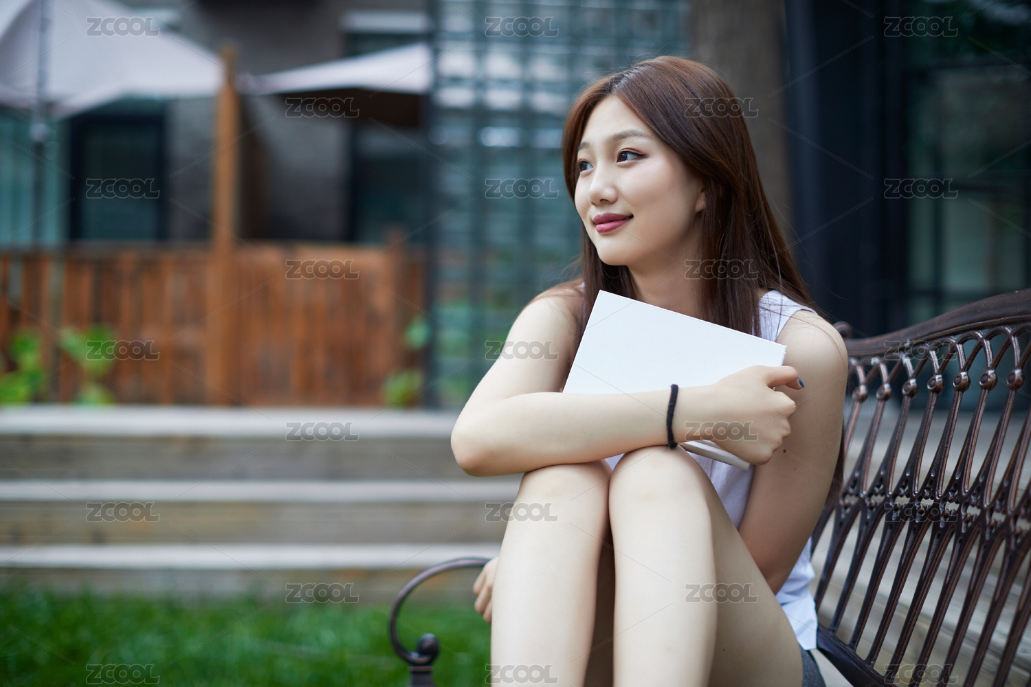 院子里坐在长椅上阅读书籍的亚洲长发少女