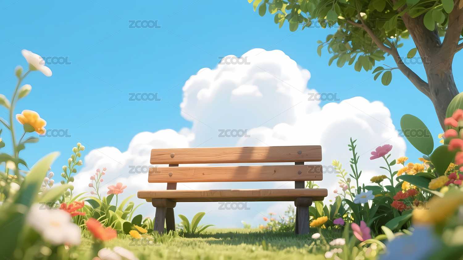 白天夏天公园里木制长椅3D卡通立体插画