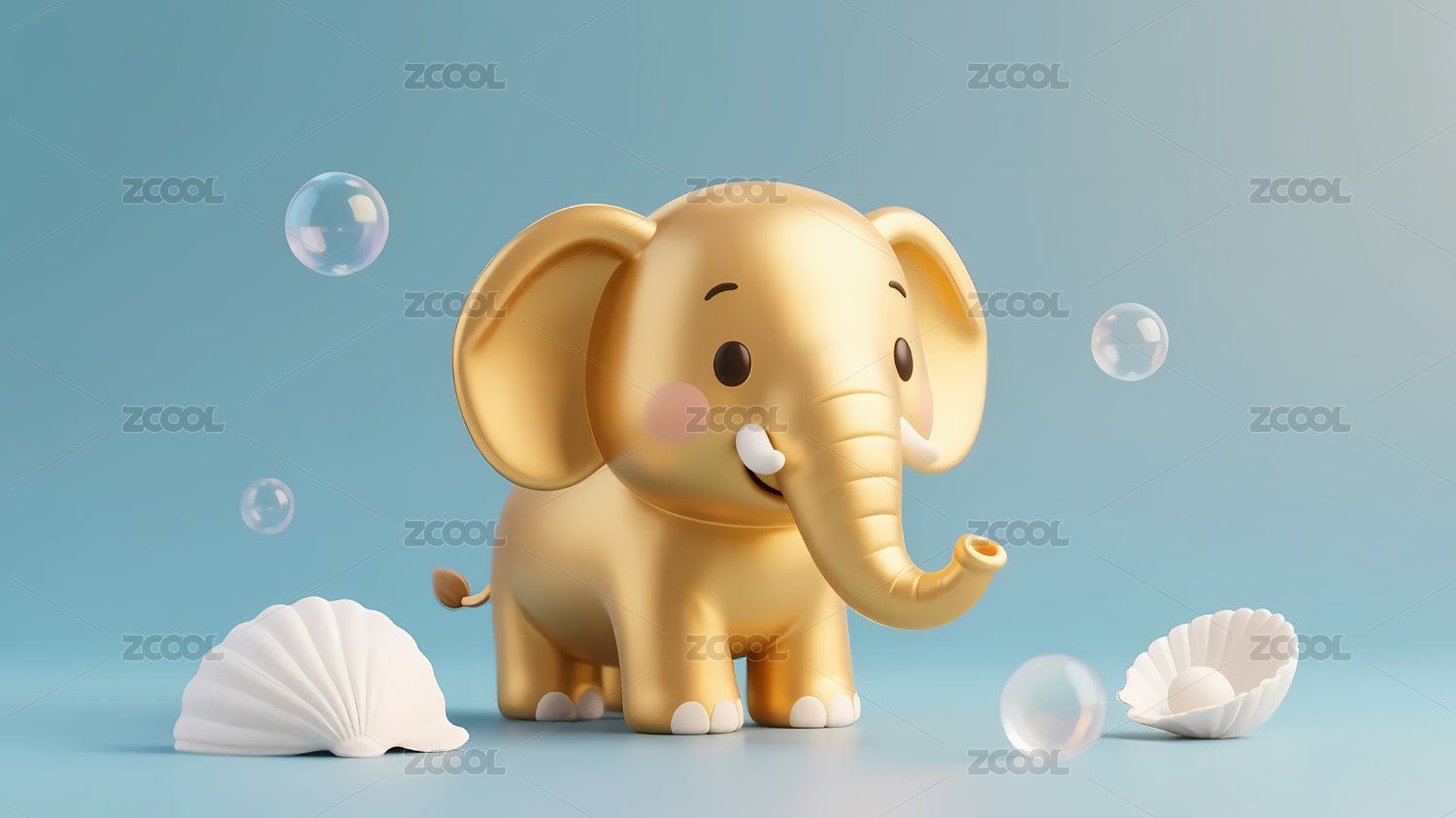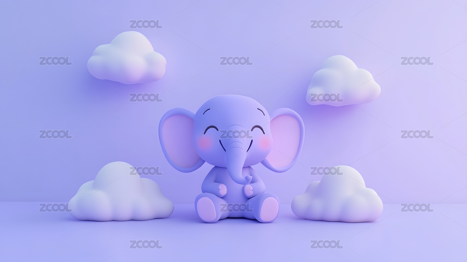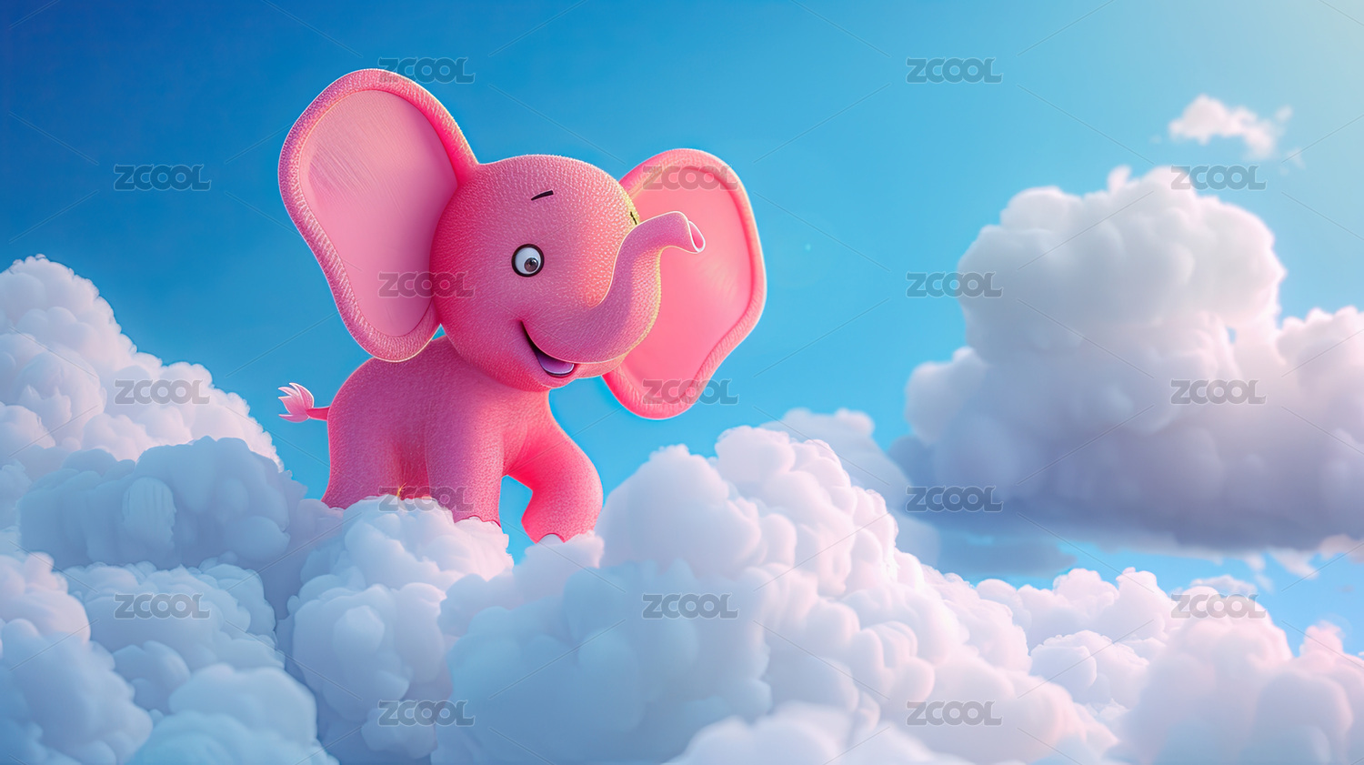 小象,云彩,趴,天空,插画,蓝色,粉色,极简,柔和,可爱