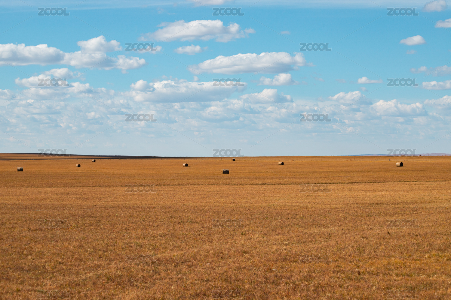 中国呼伦贝尔蓝天白云衬托辽阔草原上的草垛