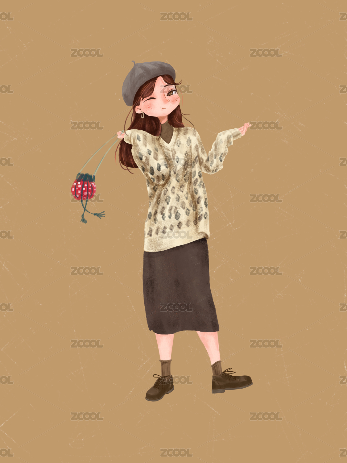 情人节拿着玫瑰鲜花的文艺女孩插画