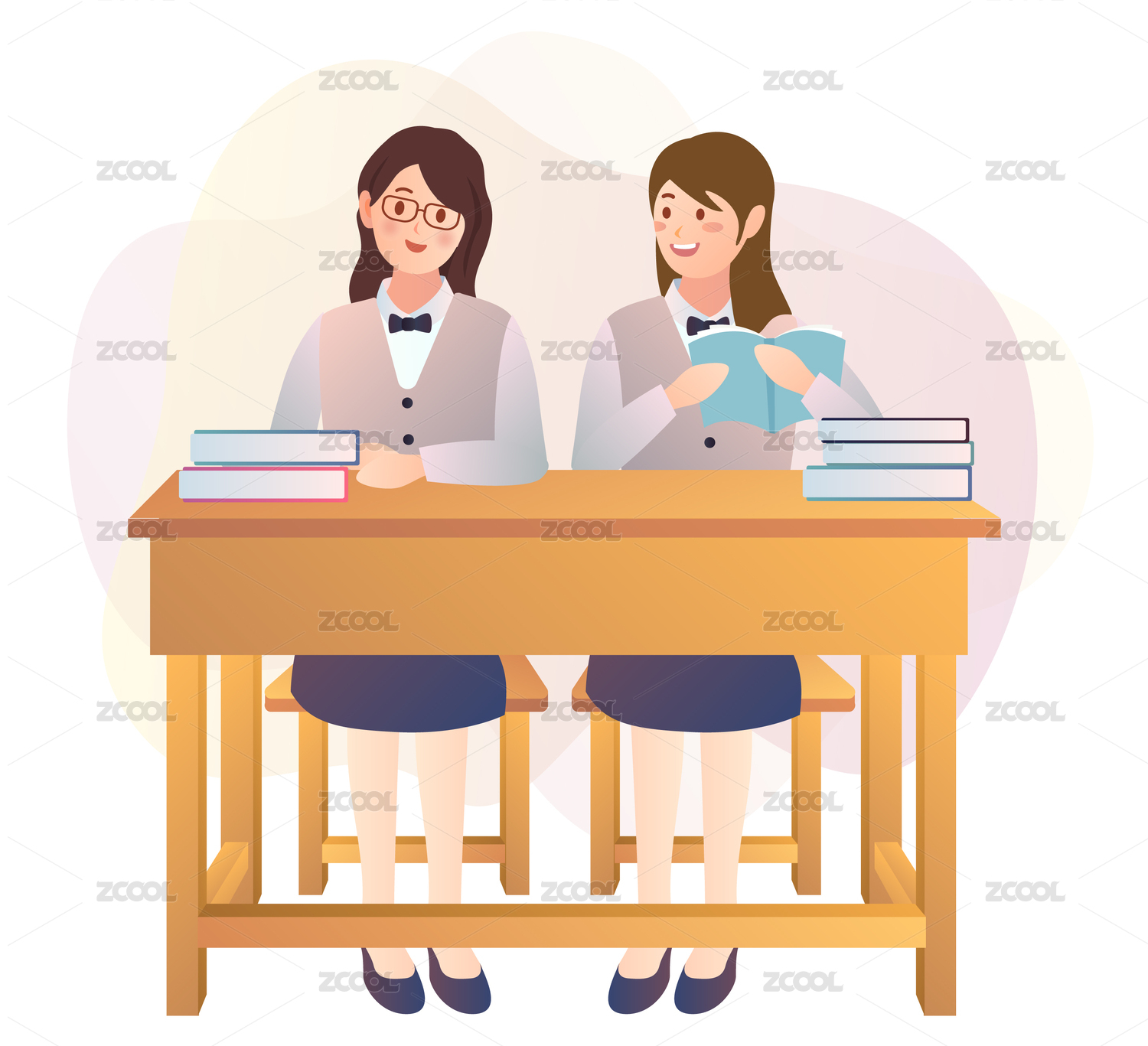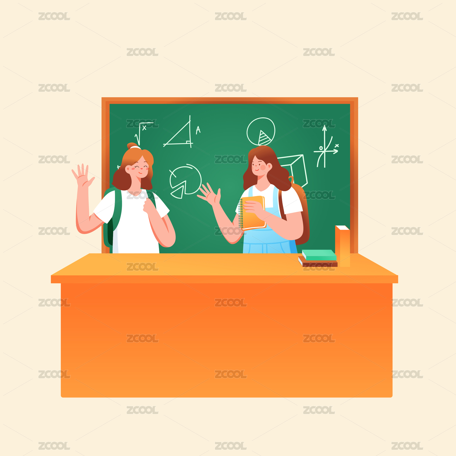 手绘插画 两位学生坐在书桌在写满公式的给办前举手加油