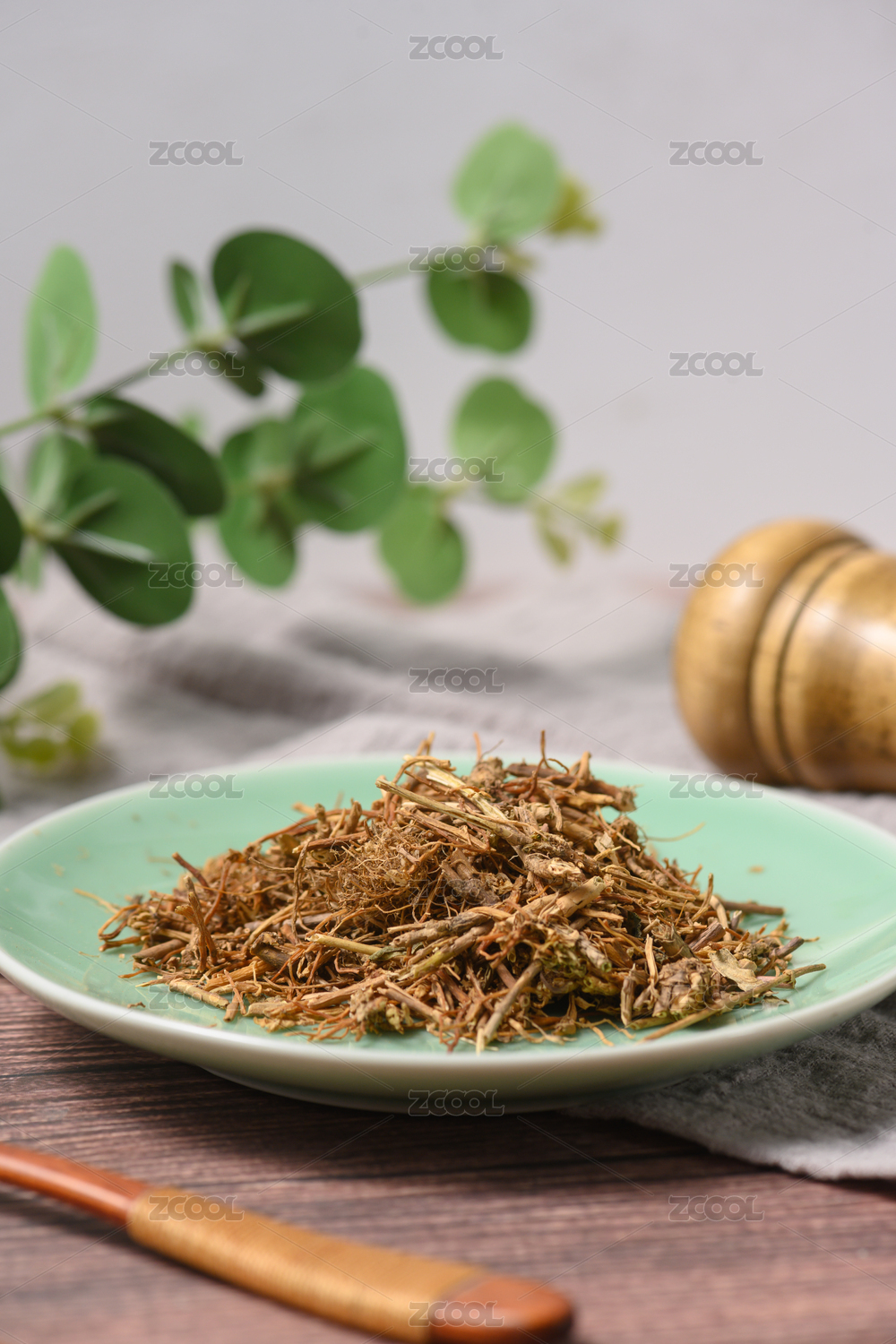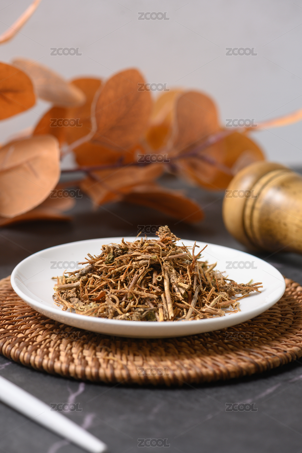 桌面上的盘子里的干爽的龙胆草