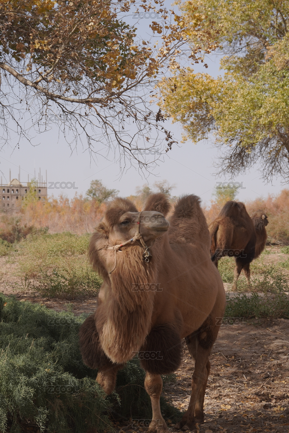 秋冬中国新疆帕米尔高原胡杨林的骆驼