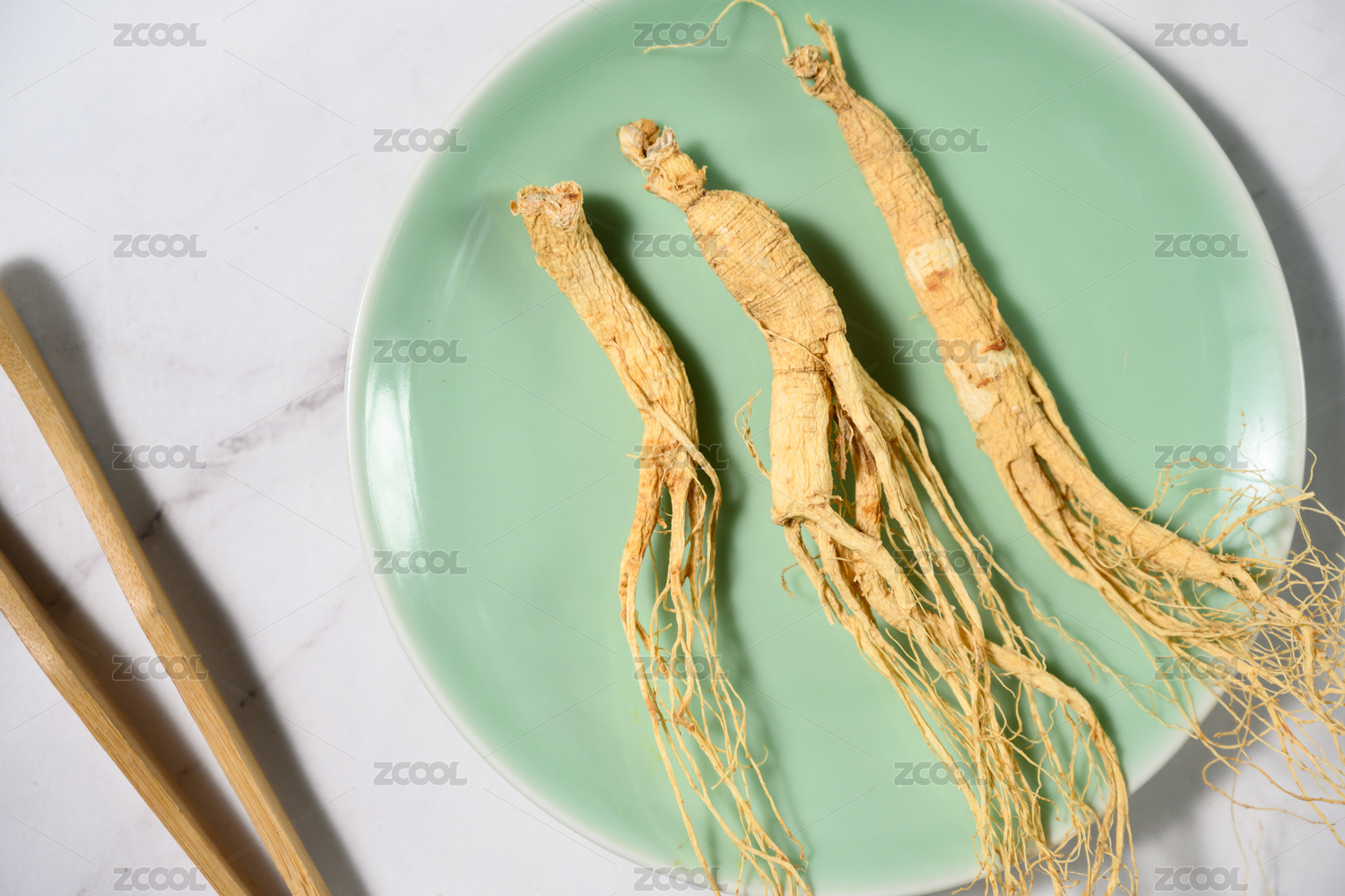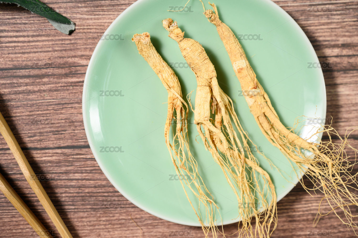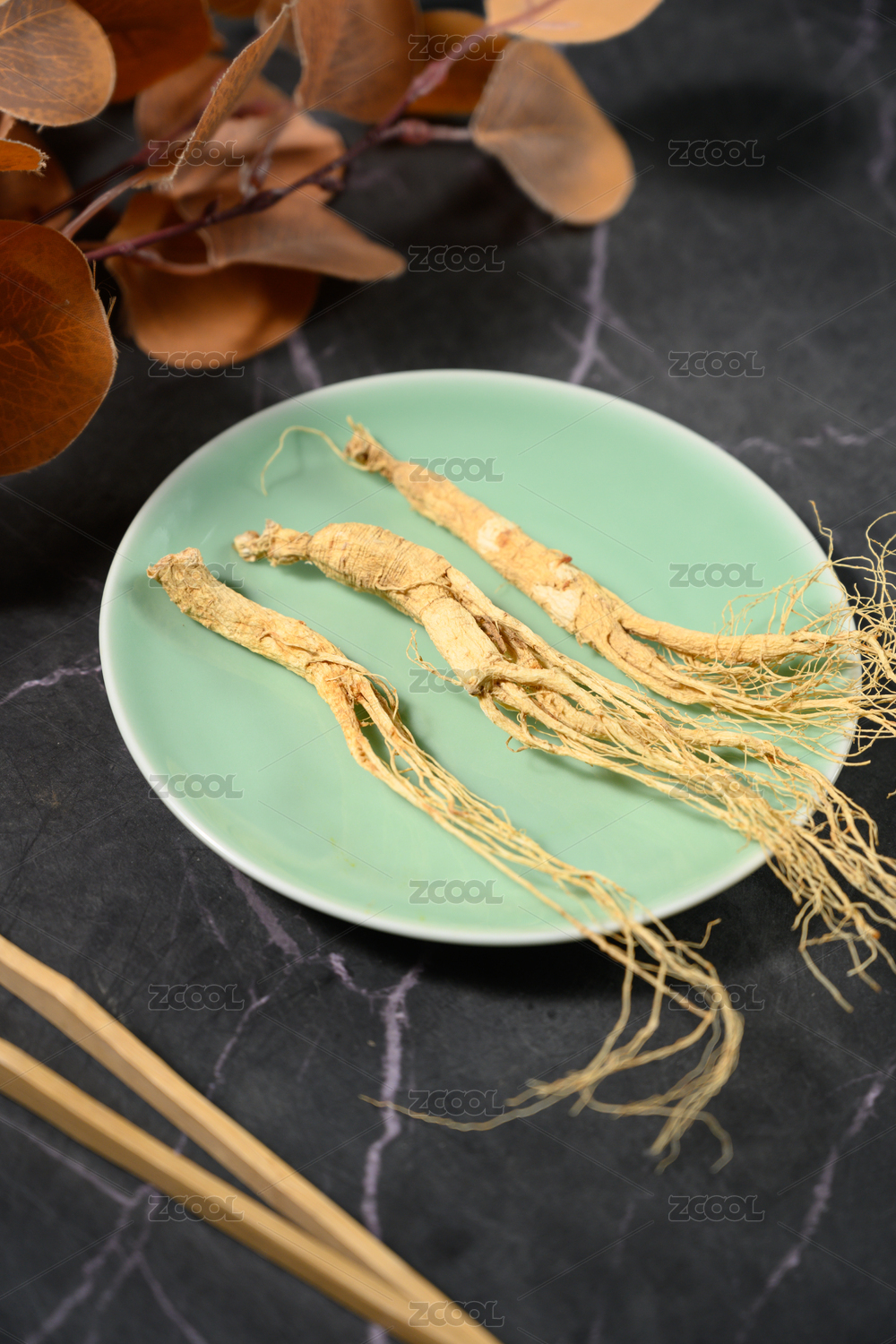 桌面上的盘子里的干爽的人参
