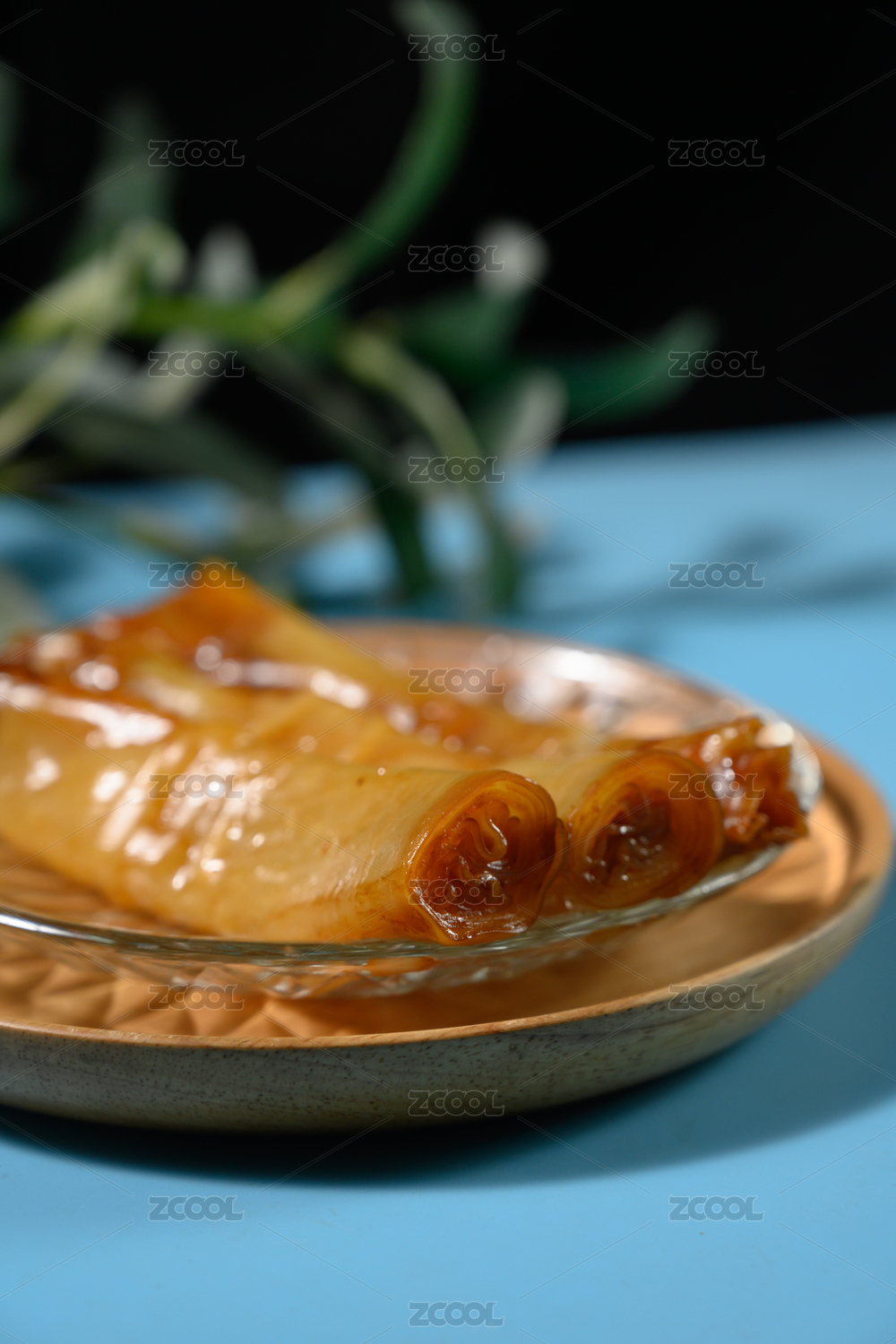 桌面上的盘子里的美味可口的腐皮卷