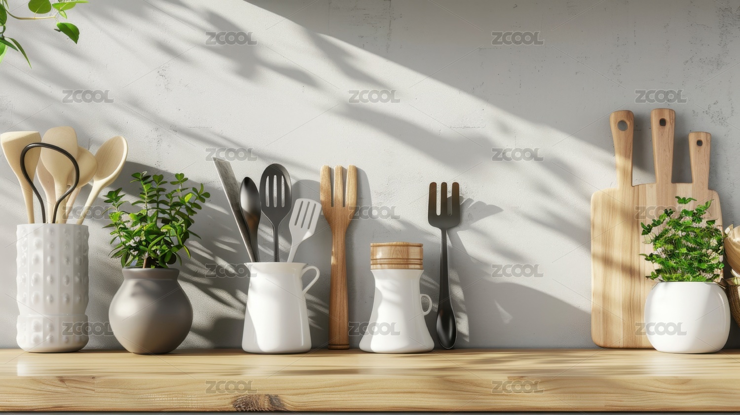 水泥墙面,木纹柜子,厨房挂钩和灶台