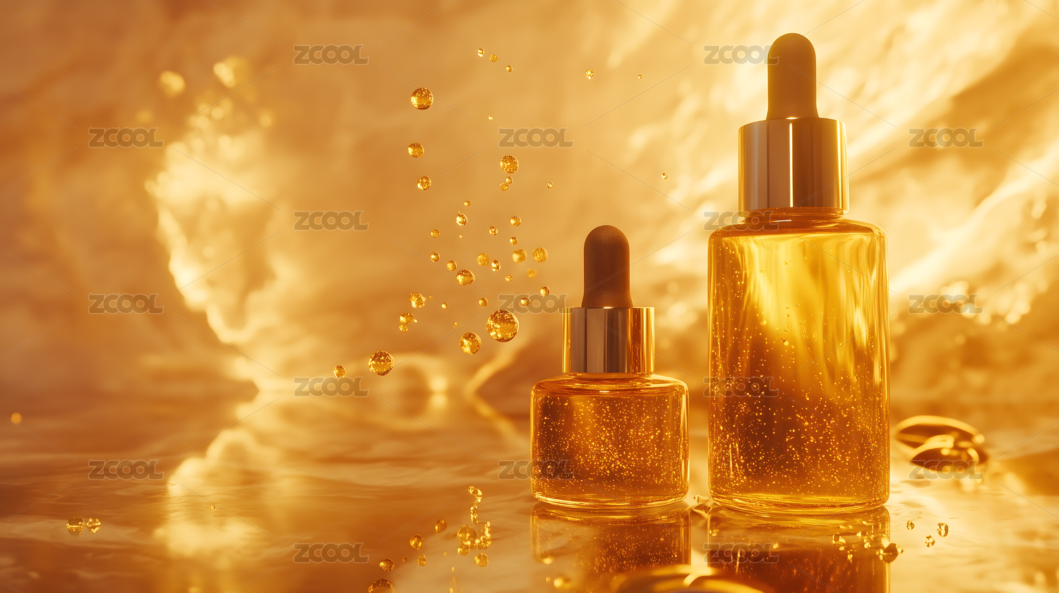 金色背景下的精华液瓶与气泡