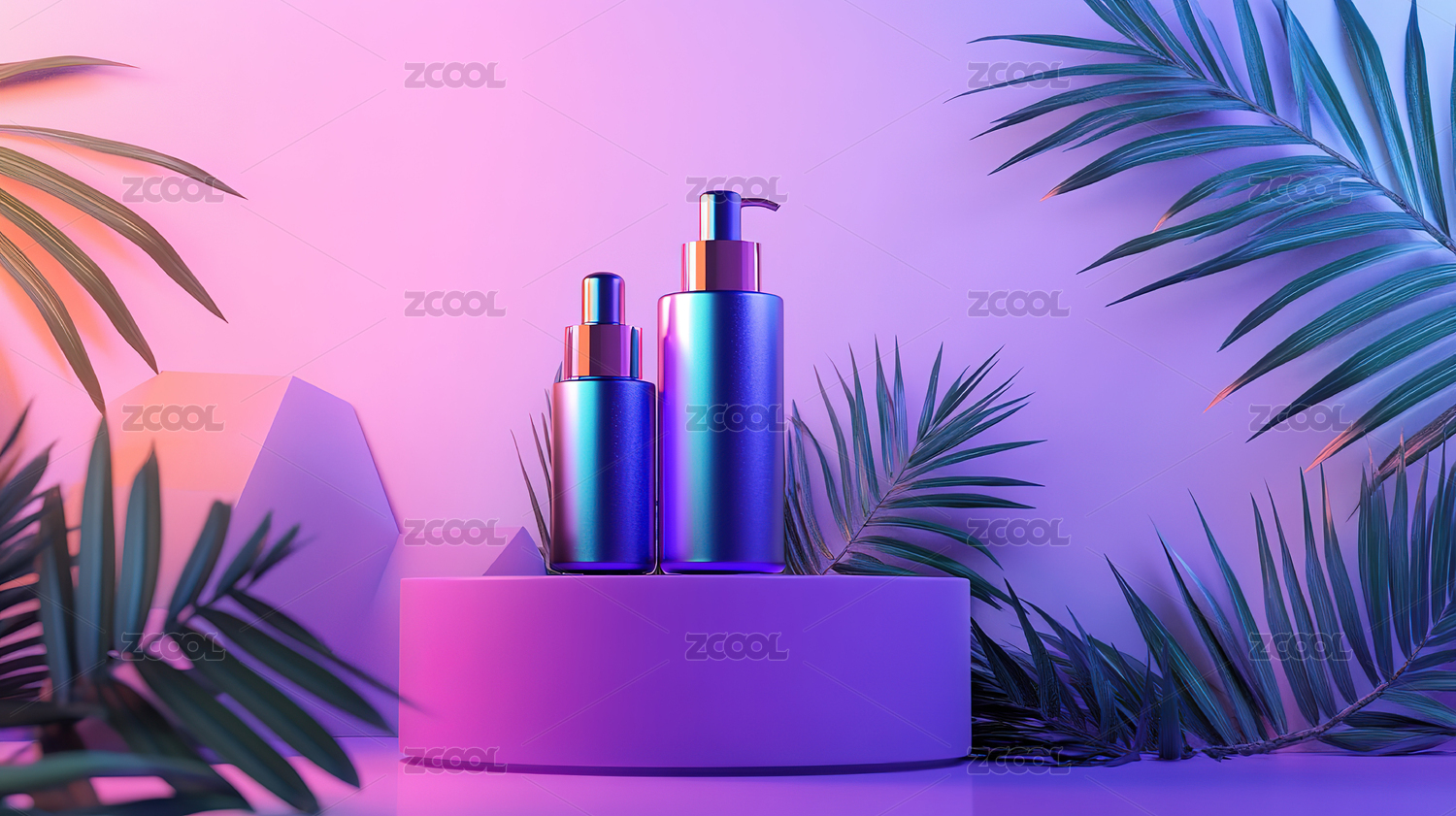 简约粉色瓶装产品与绿叶装饰