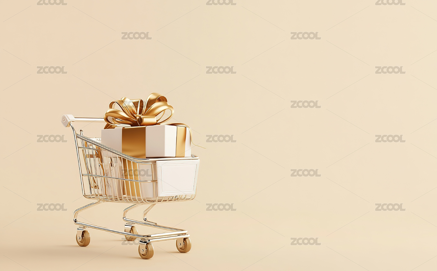米色背景下购物车中的金色礼物特写镜头