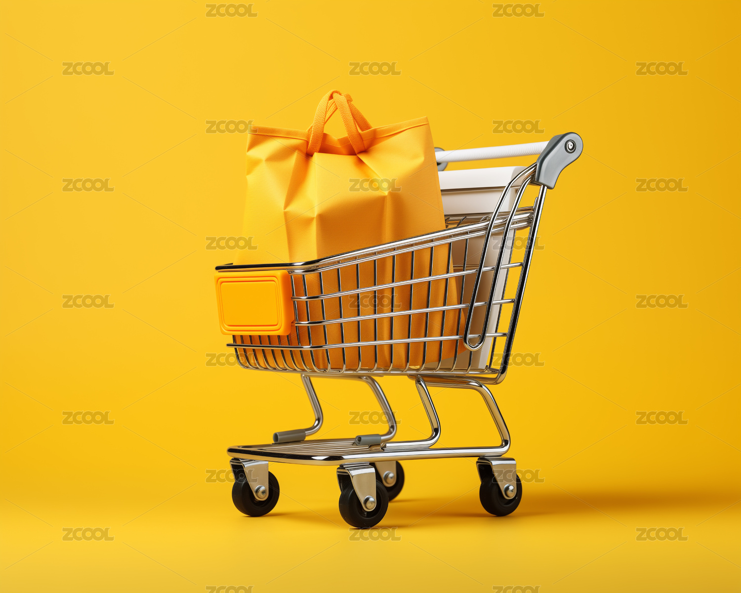 黄色背景下的小购物车特写镜头
