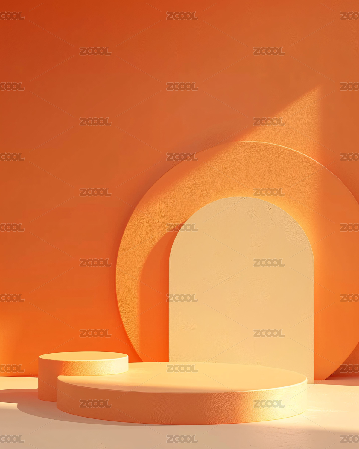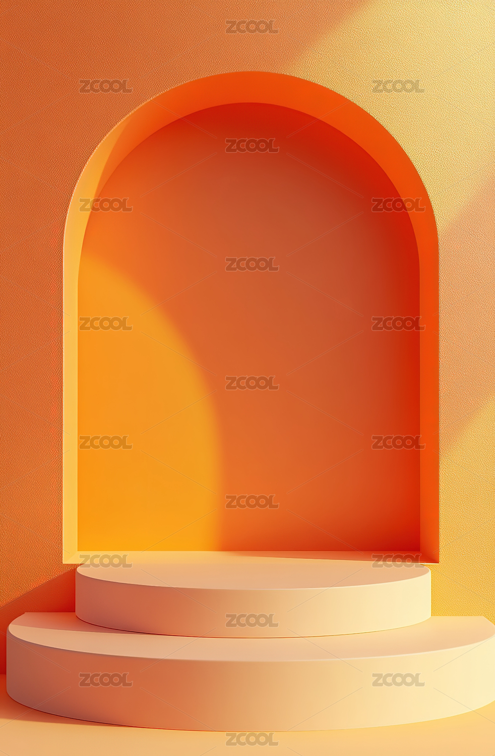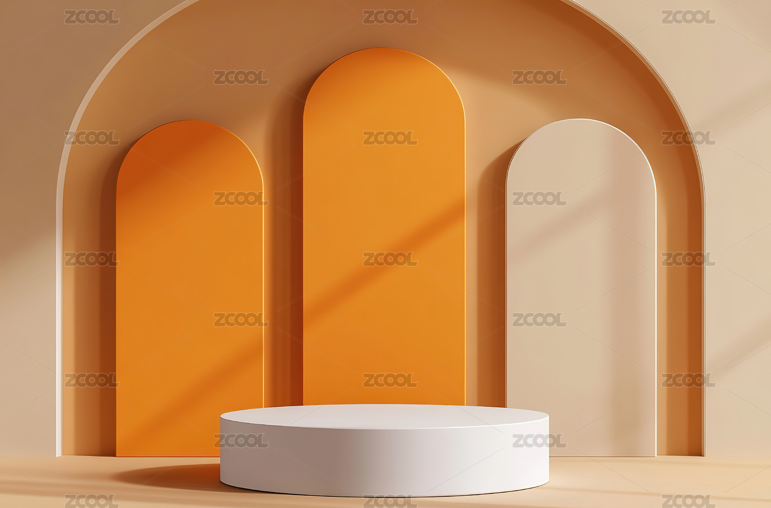 三维渲染的灰黄色圆形拱门几何体展台背景