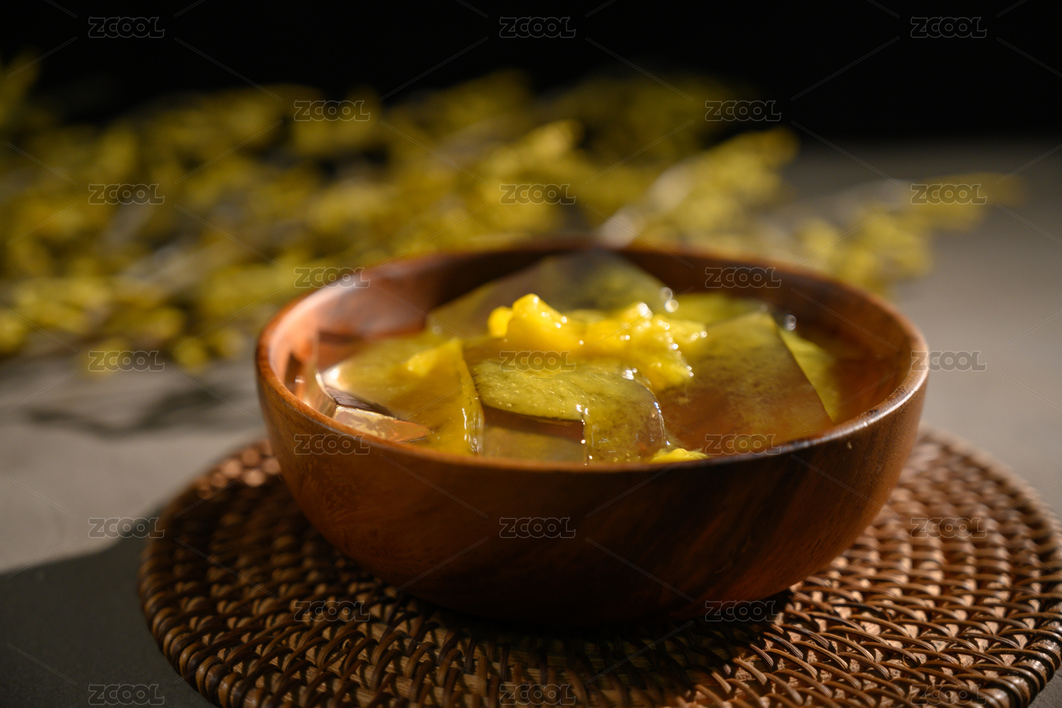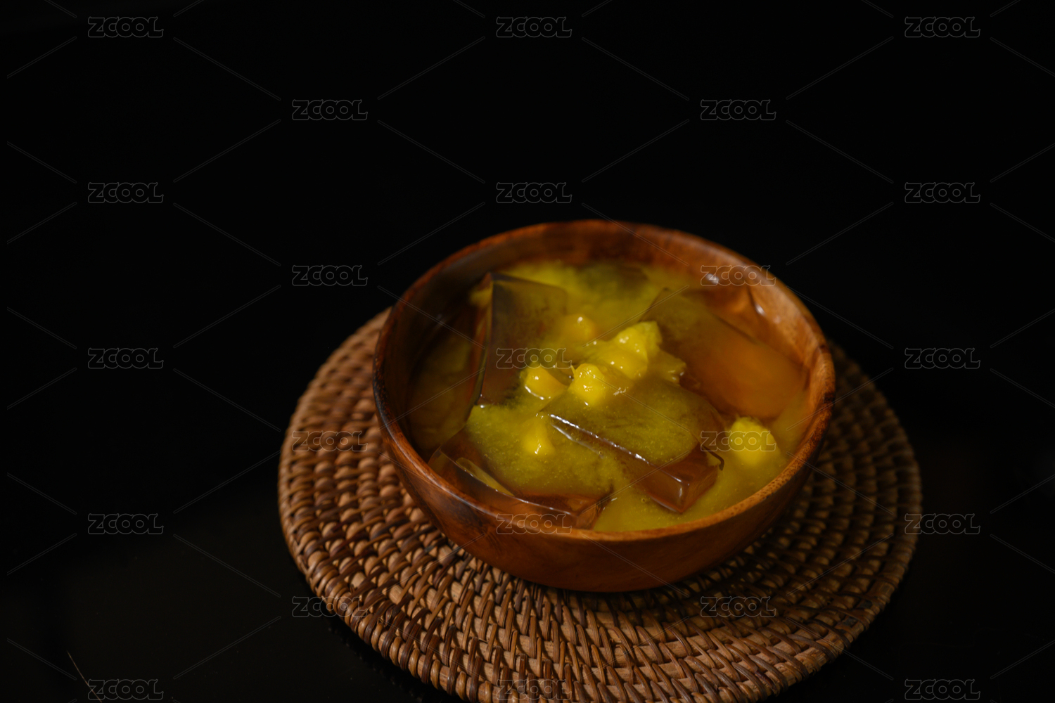 桌面上的碗里的美味可口的芒果凉粉