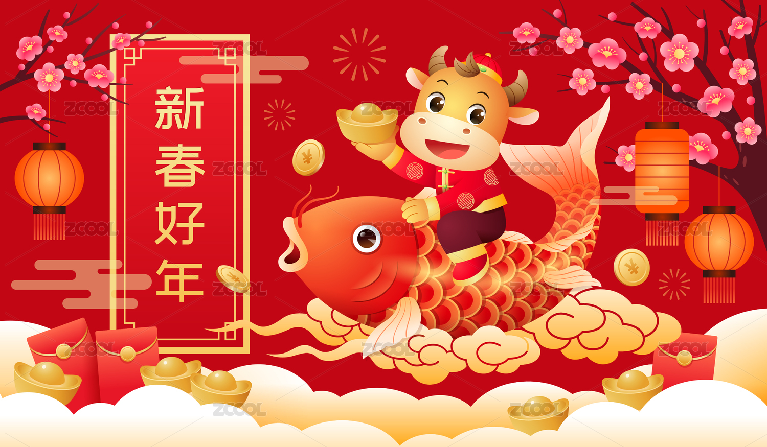春节牛骑鲤鱼和梅花灯笼等插画