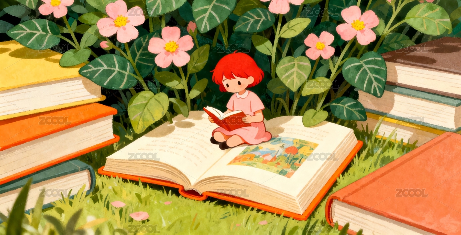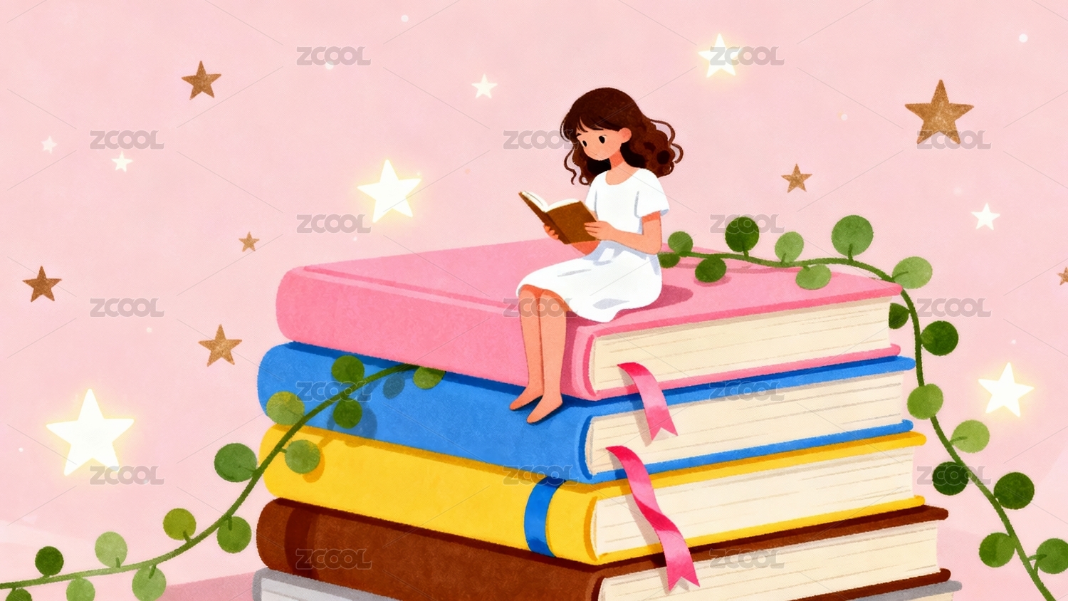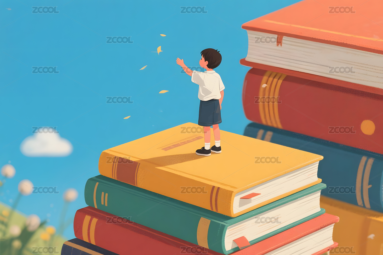 男孩,女孩,书本,纸张,蓝天白云,太阳,星星,云朵,绿色短裤,红色书脊