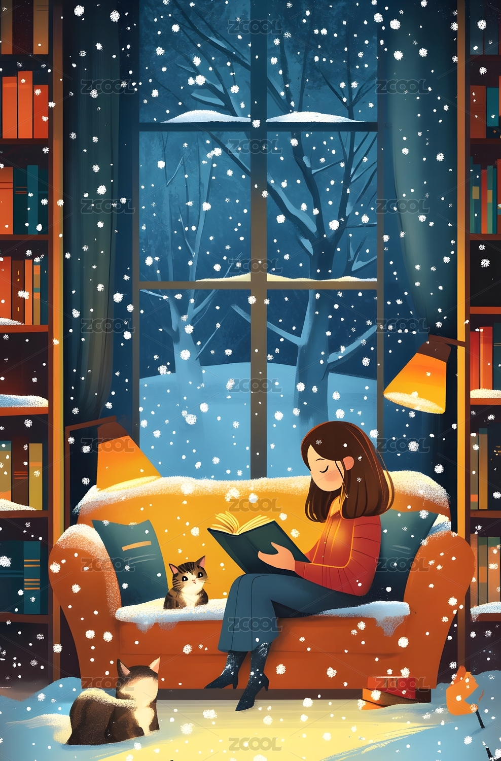 冬天女生居家学习治愈插画