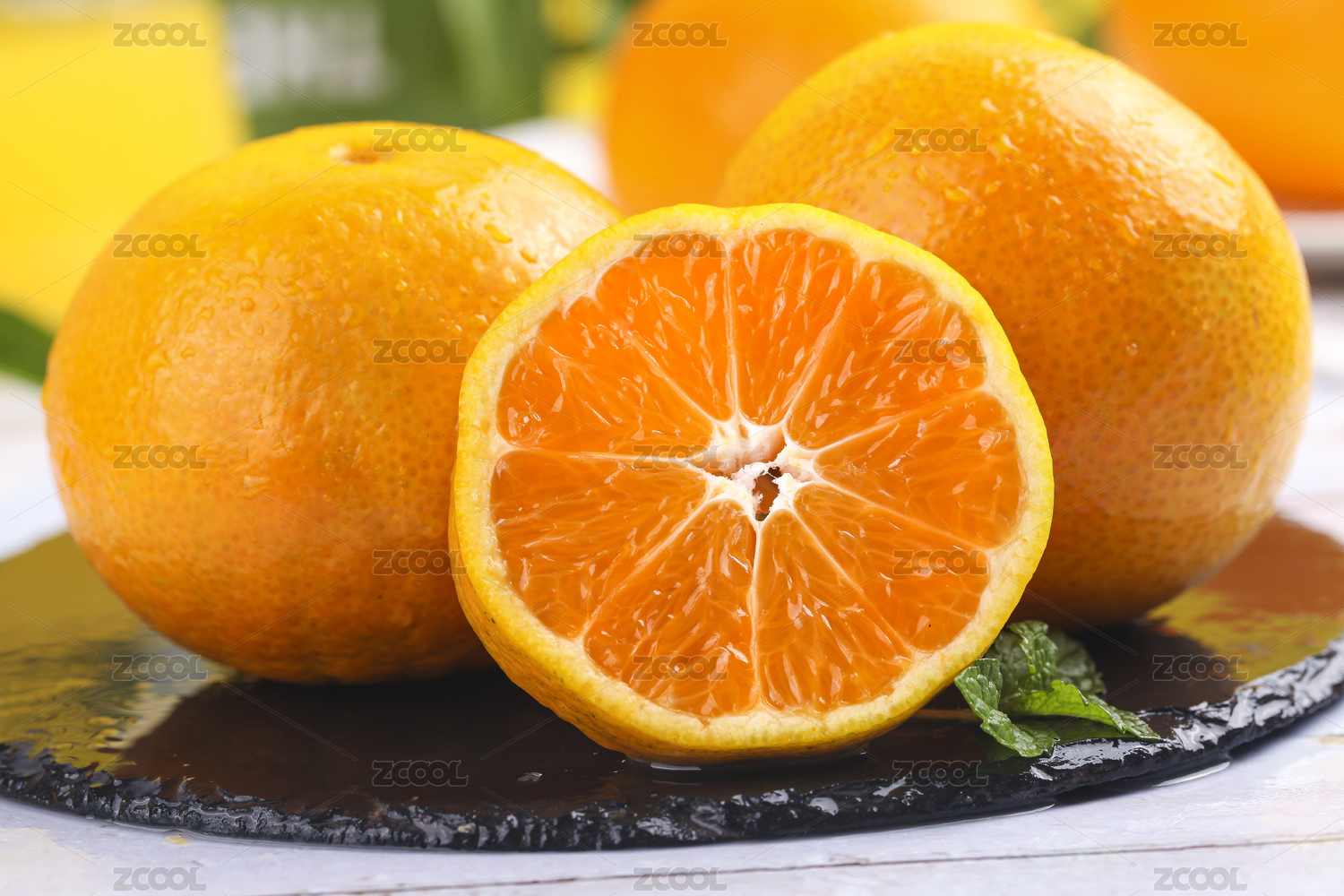 黑石板上放着一堆湖南麻阳冰糖橙和切块橙子