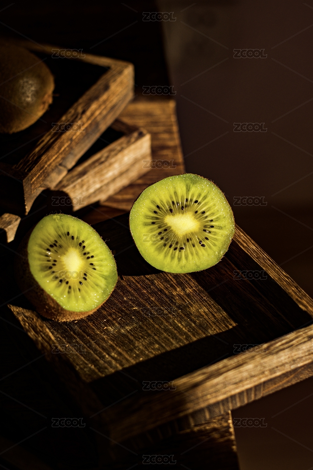 切开放在圆形木盘子上的新鲜绿心猕猴桃