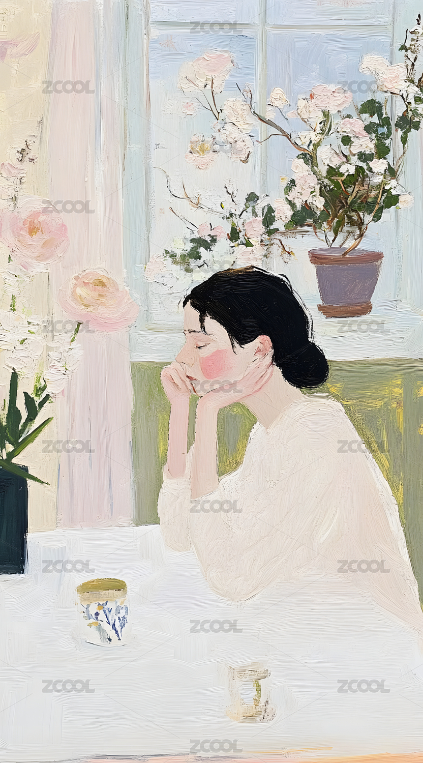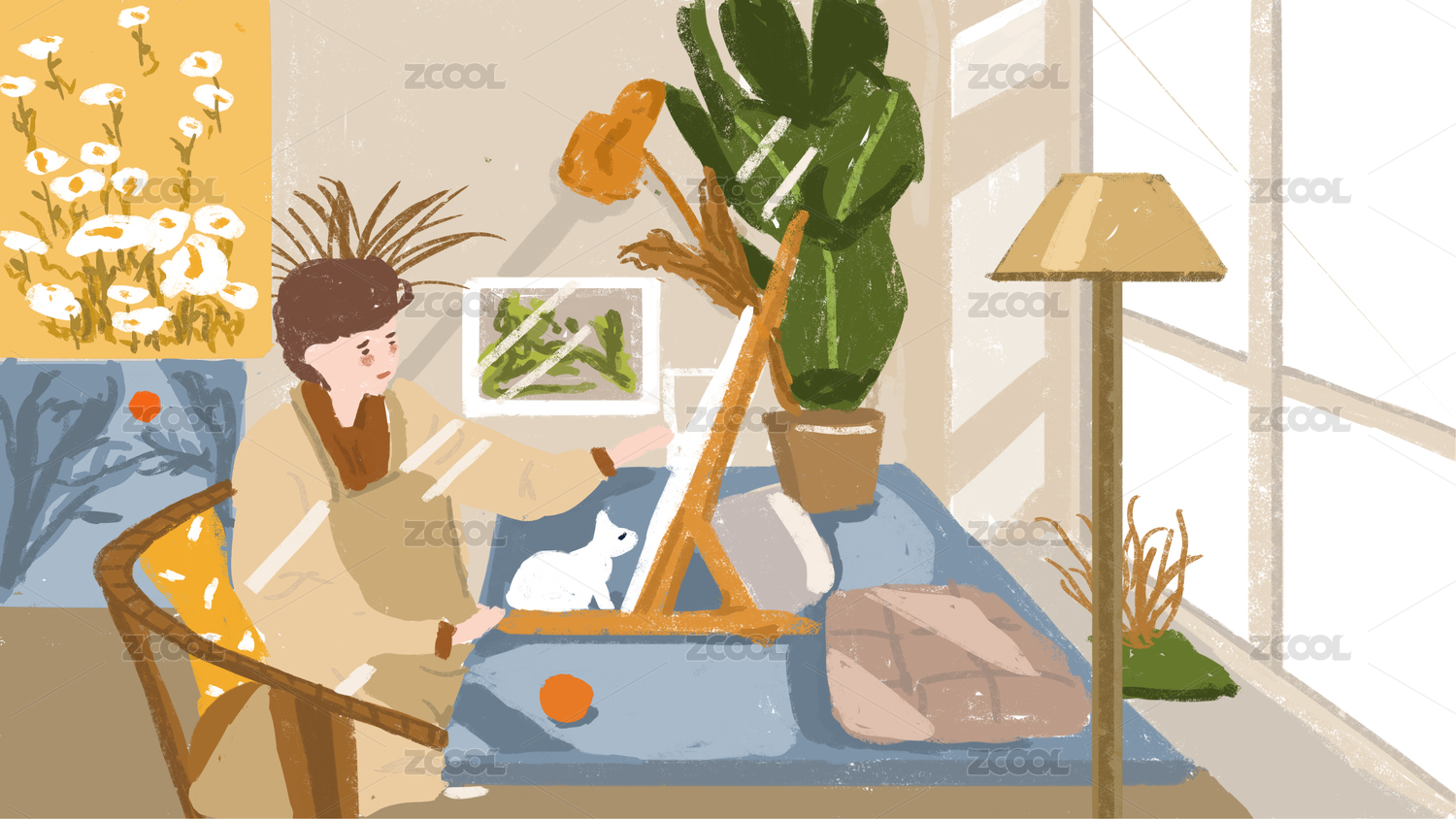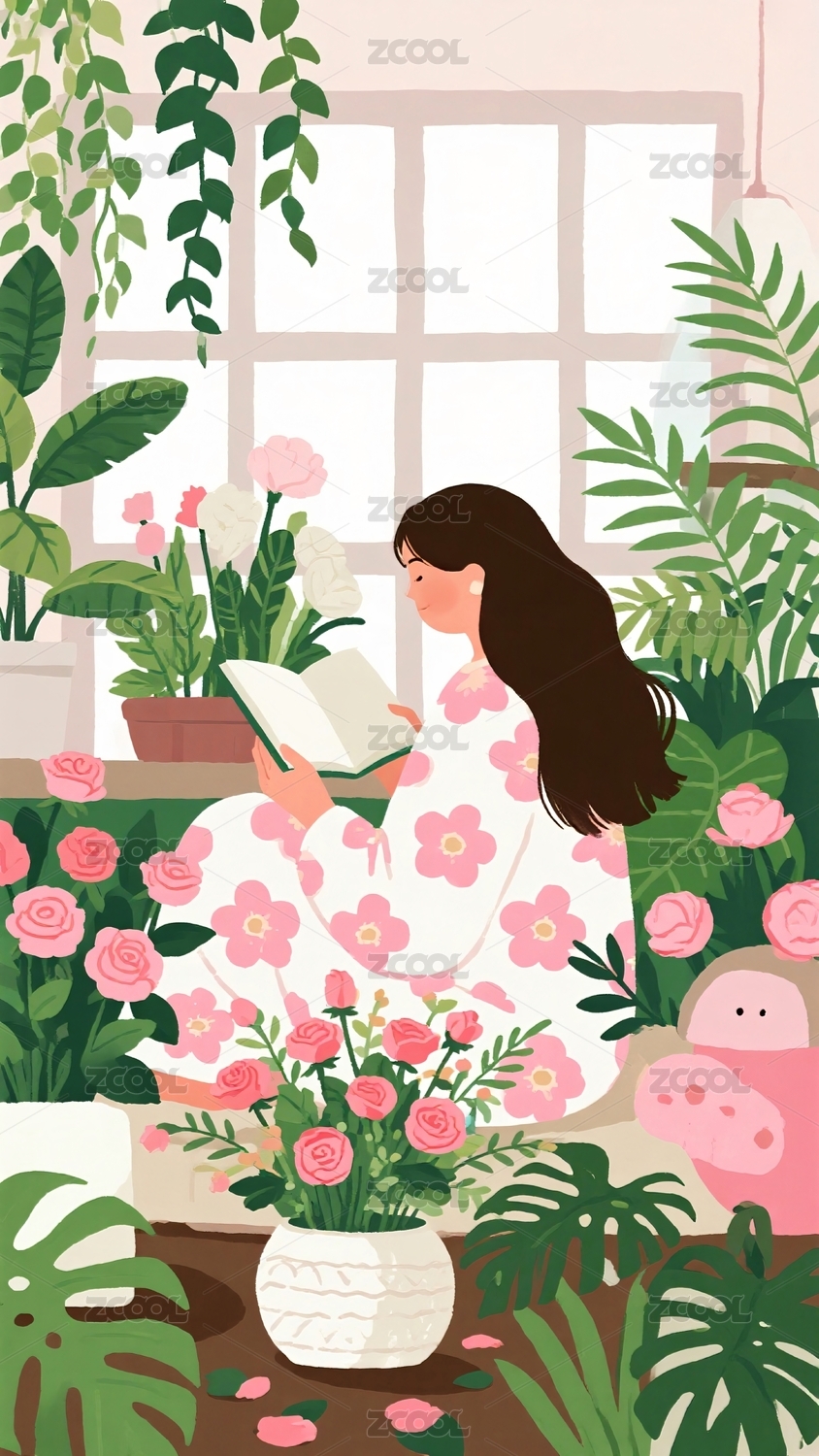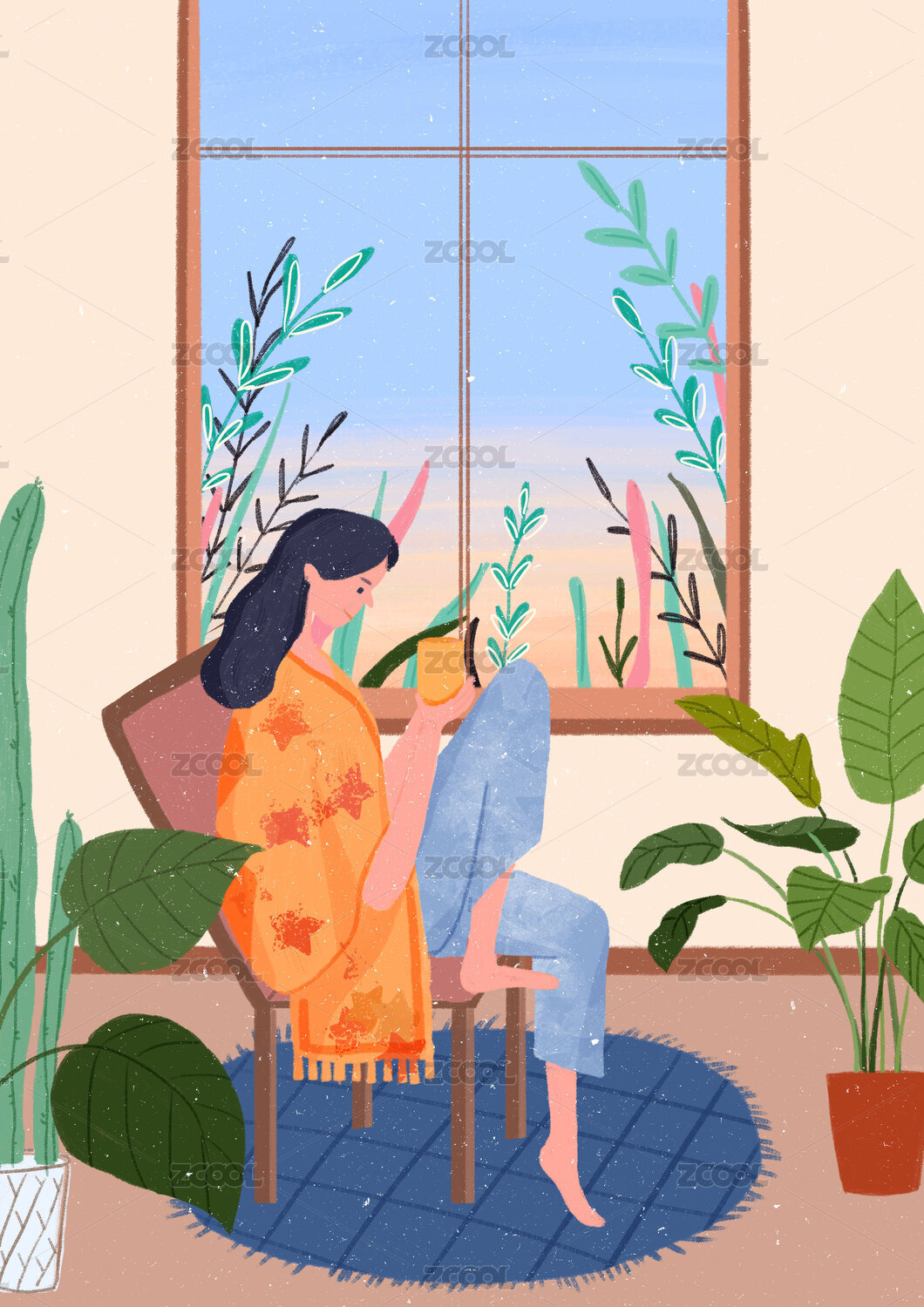 女孩,人物,生活,居家,现代,室内,插画,竖幅,清扫,日常