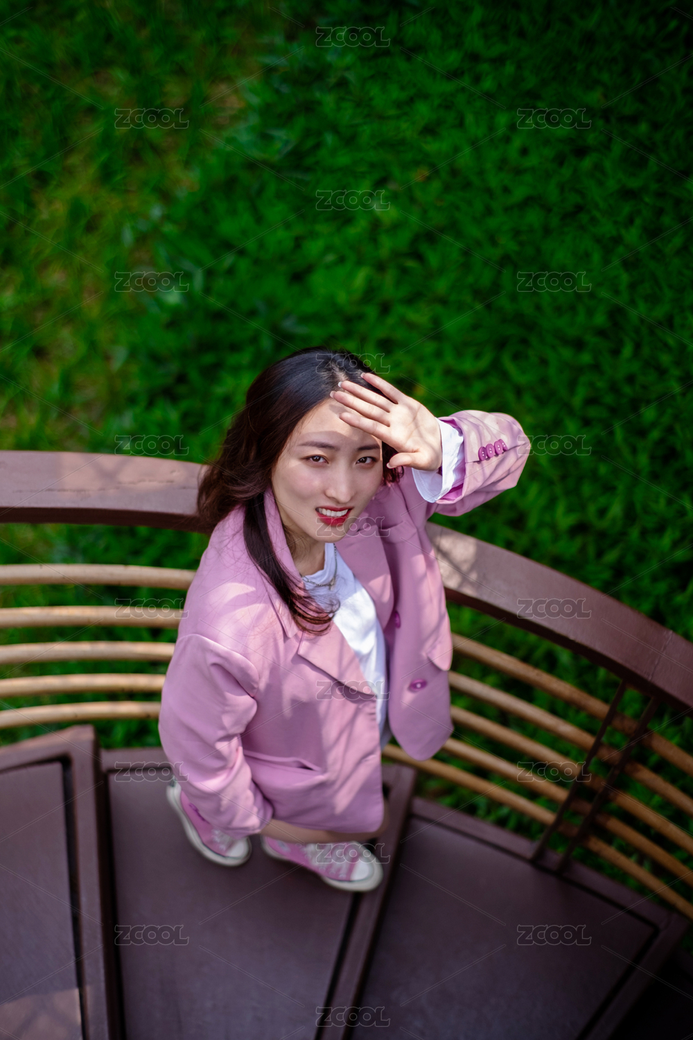 女性,中国人,表情,嘟嘴,伸手指,造型,坐着,长椅,户外,一个人