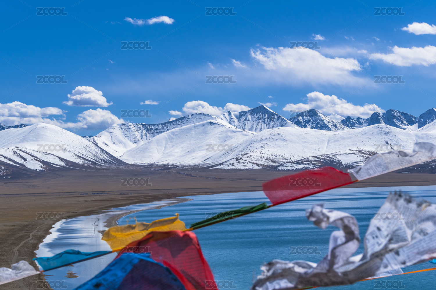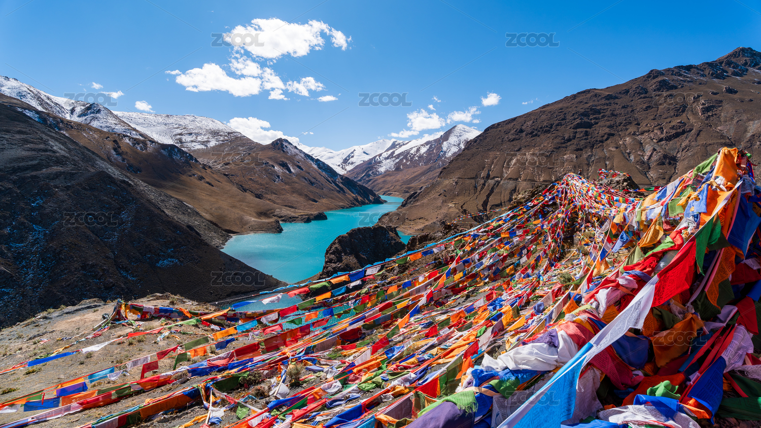 中国西藏斯米拉山、满拉水库与岸边的经幡