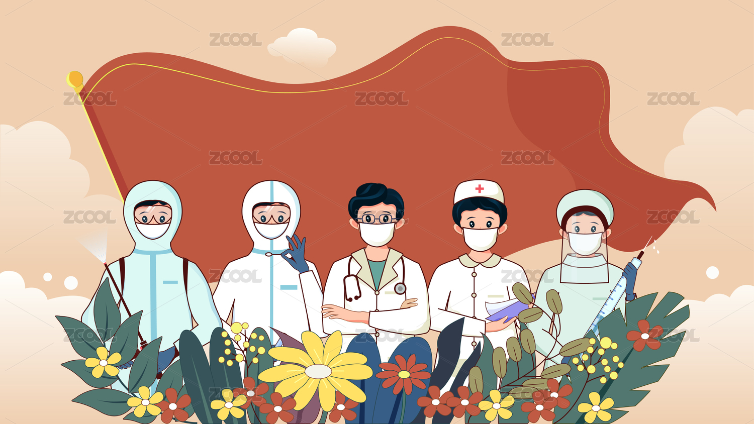 红旗下的医疗团队们矢量插画