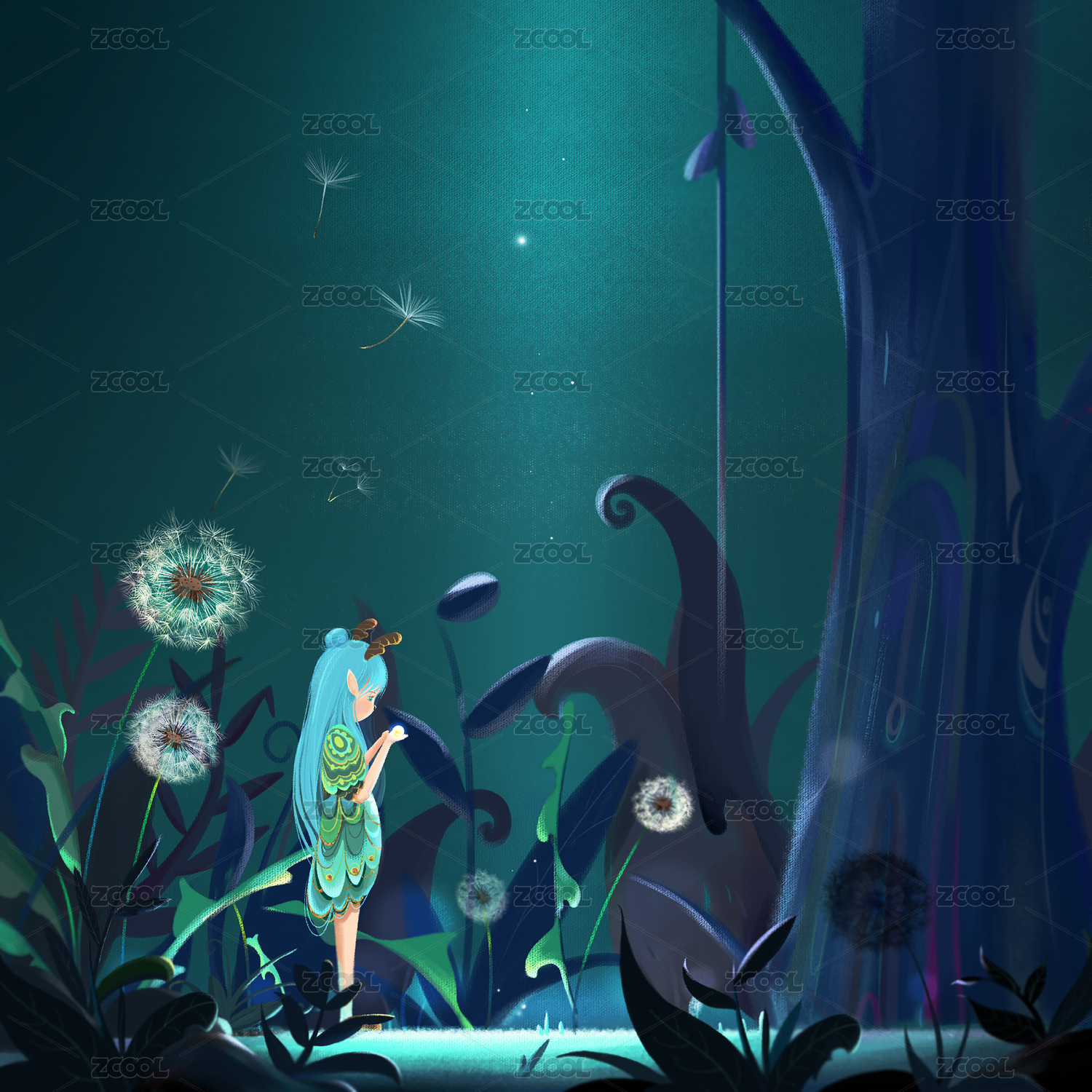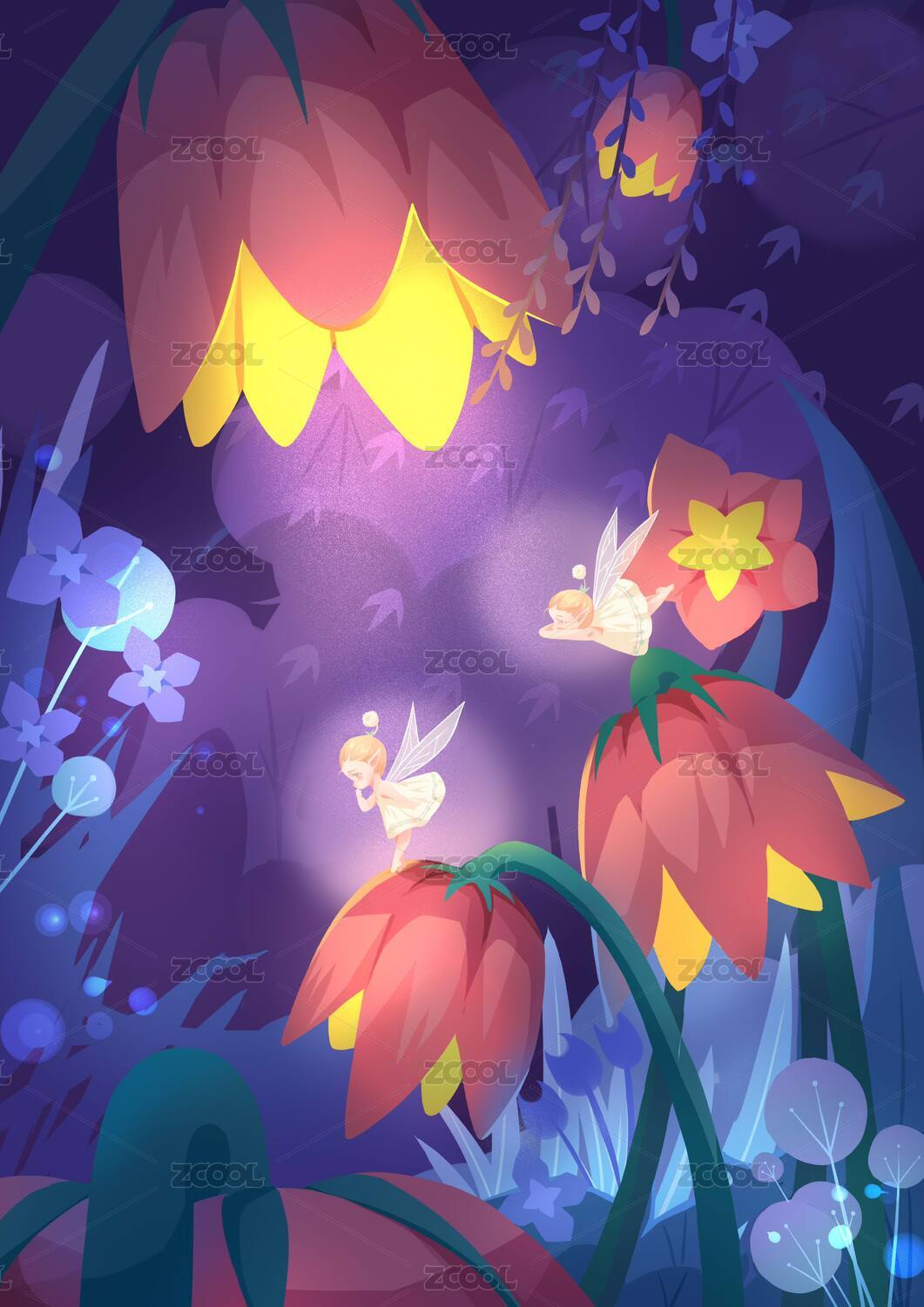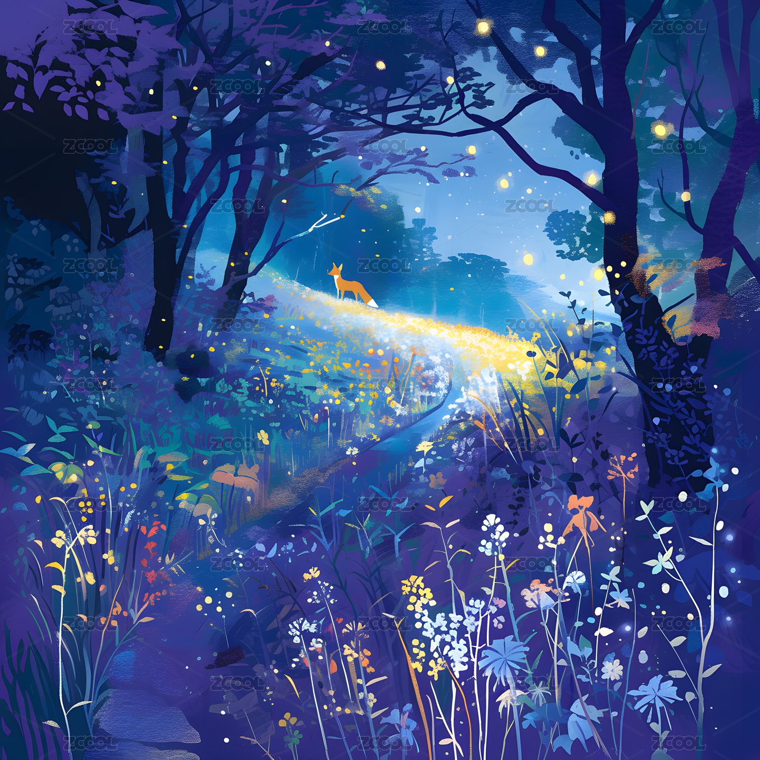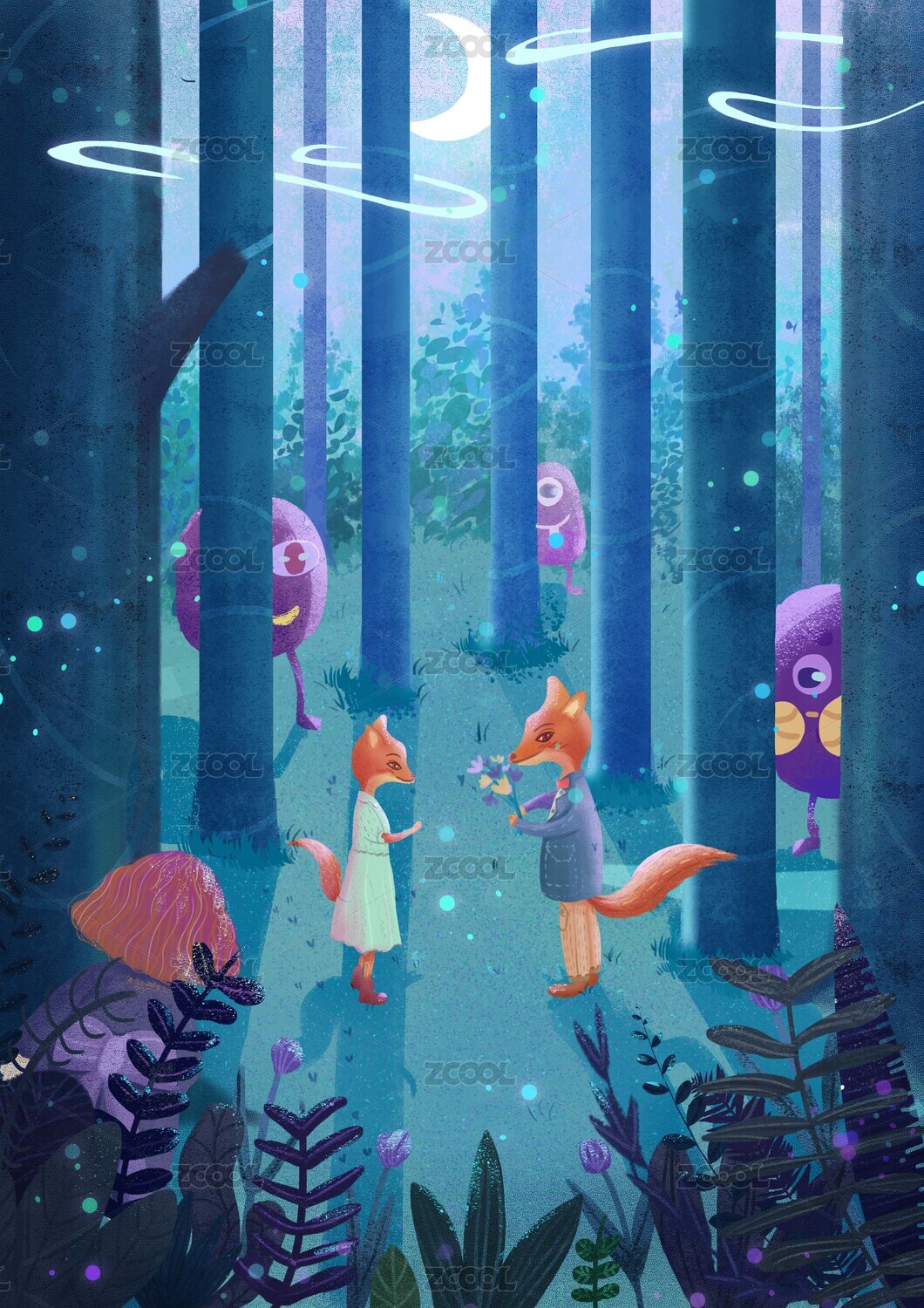 女孩和精灵伙伴在晚上偷偷看着狐狸的约会