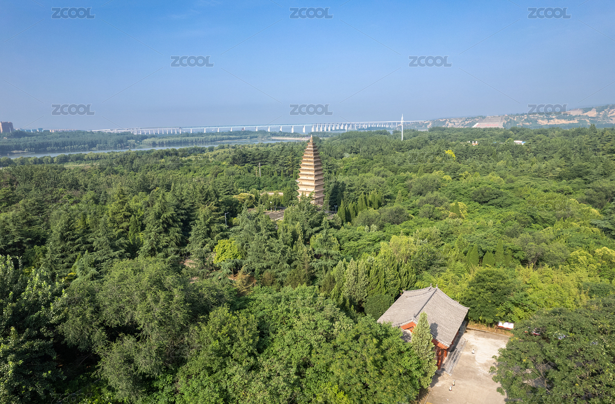 航拍河南三门峡黄河湿地公园宝轮寺塔全景