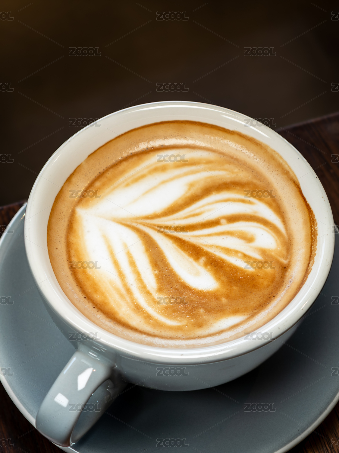 装在淡蓝色陶瓷咖啡杯里的精致拉花咖啡