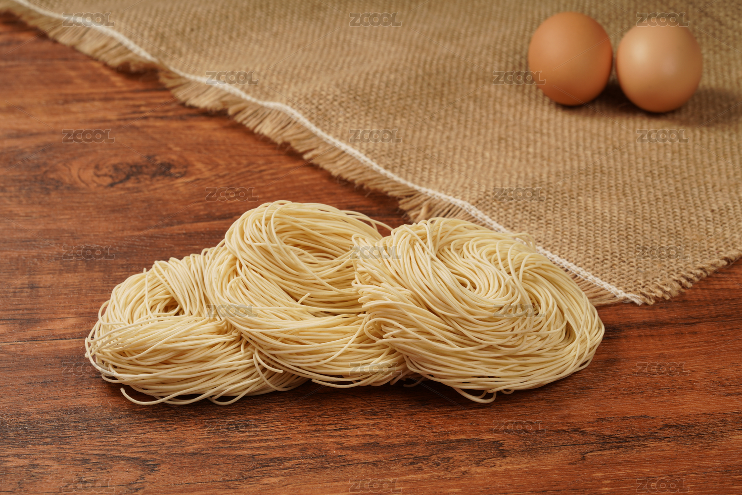 木纹桌面上摆着的生的干面条和鸡蛋