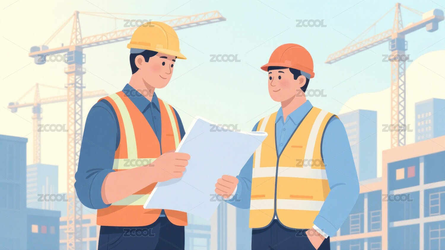 在建筑工地看图纸的两个建筑工人矢量插画