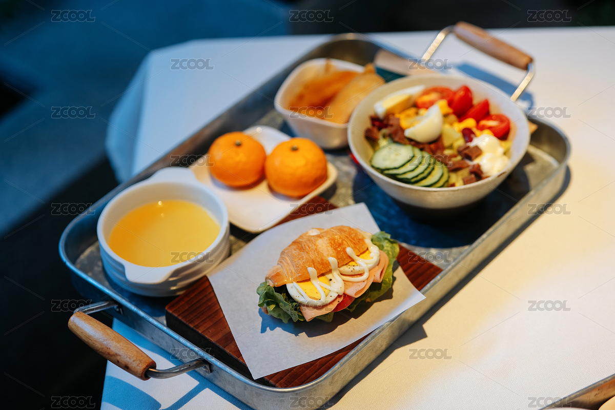 明亮朝气健康的早餐,生食蔬菜沙啦, 有新鲜生菜, 有乳酪奶昔,西式炒蛋搭配原味面包 ,