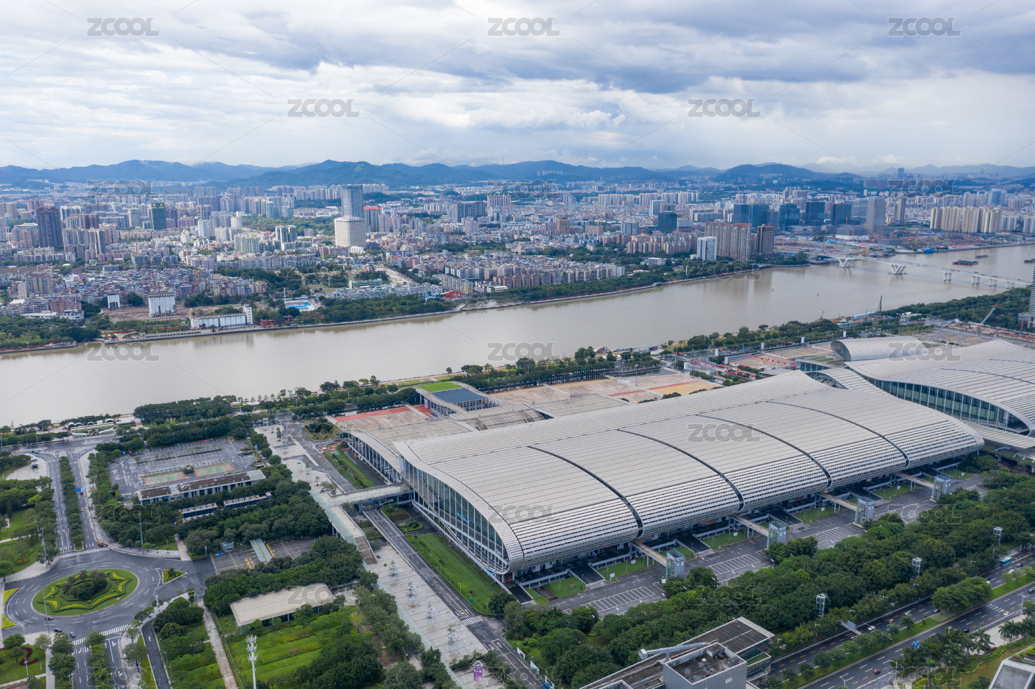 福建福州海峡国际会展中心与桥梁的空中俯瞰