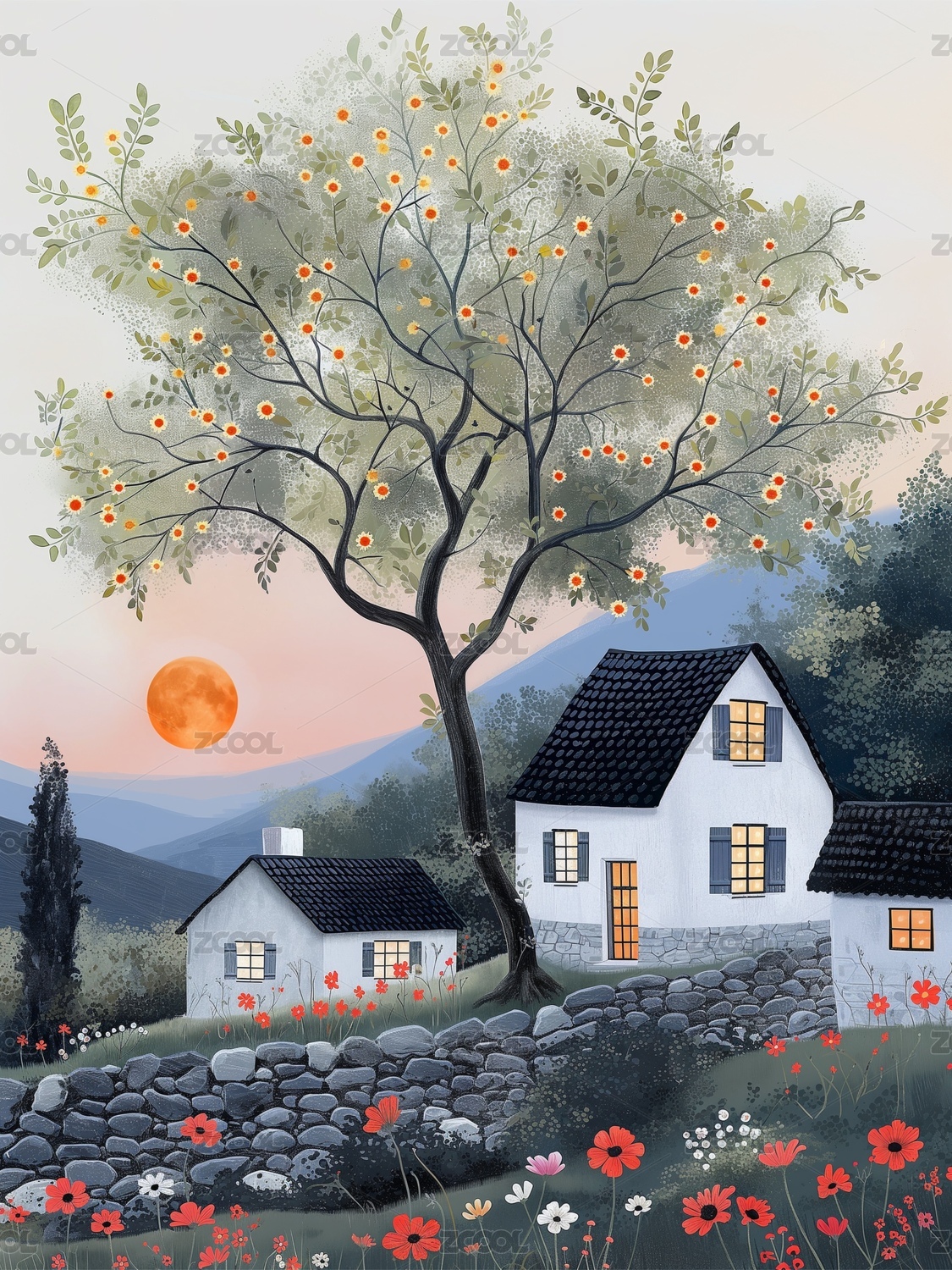落日,房屋,风景画,绘本插画,大树,扁平风