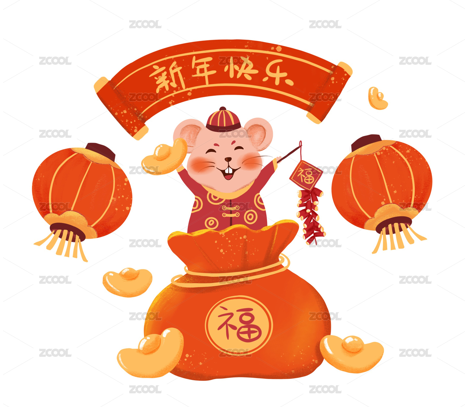 过年坐在福袋上拿着元宝提着鞭炮和灯笼的老鼠