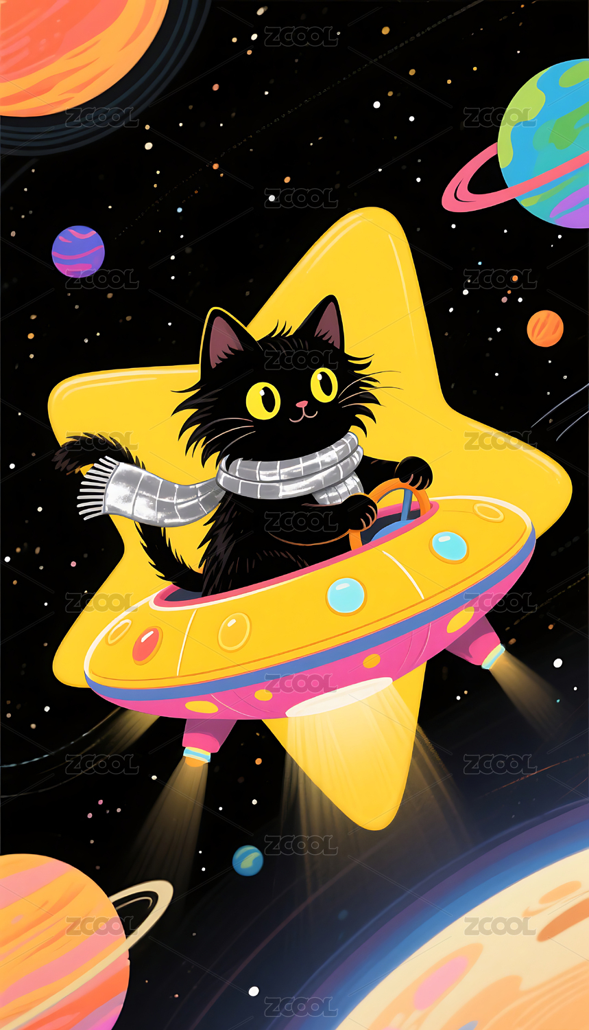 大猫宇航员与纸飞机小人在宇宙太空相遇