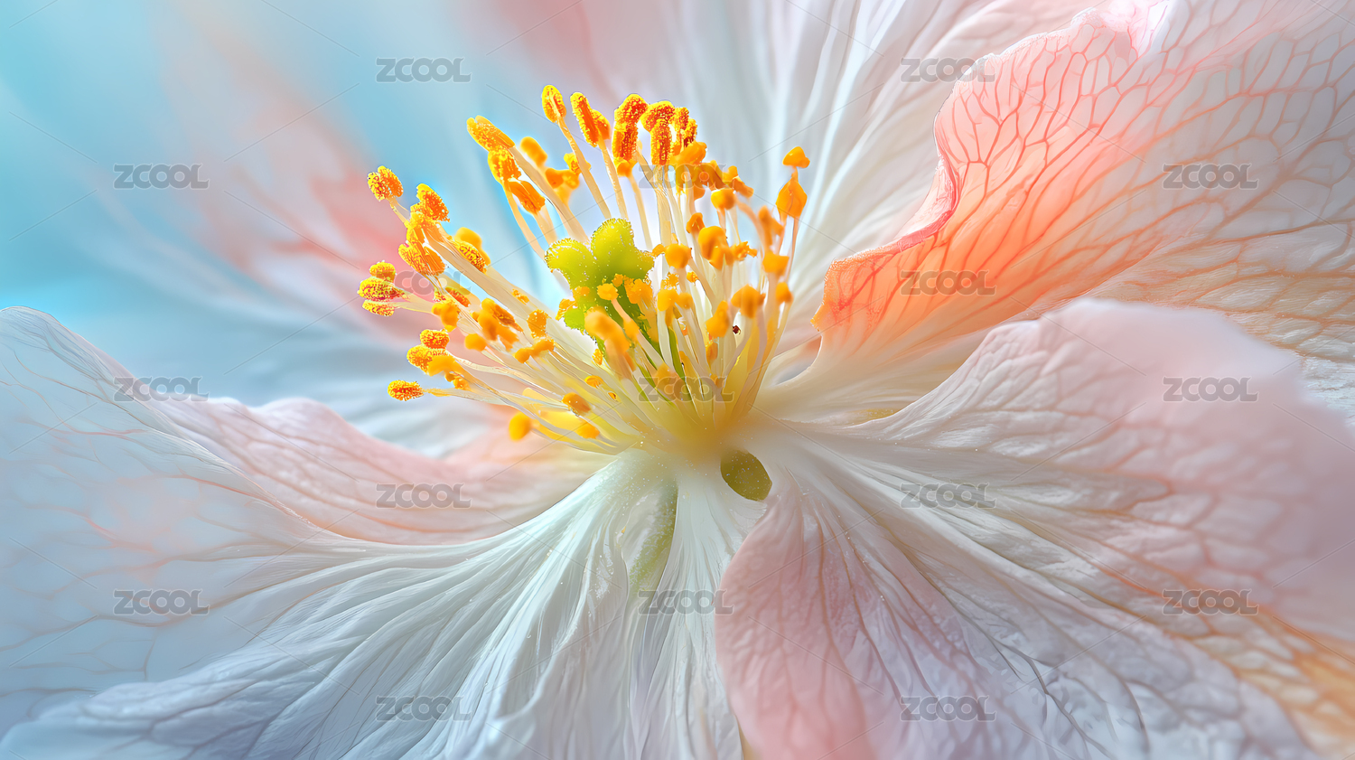 特写浅粉花朵花蕊橙黄雄蕊与绿色雌蕊清晰呈