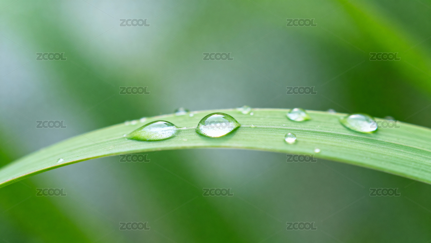 嫩绿草叶上的水珠特写