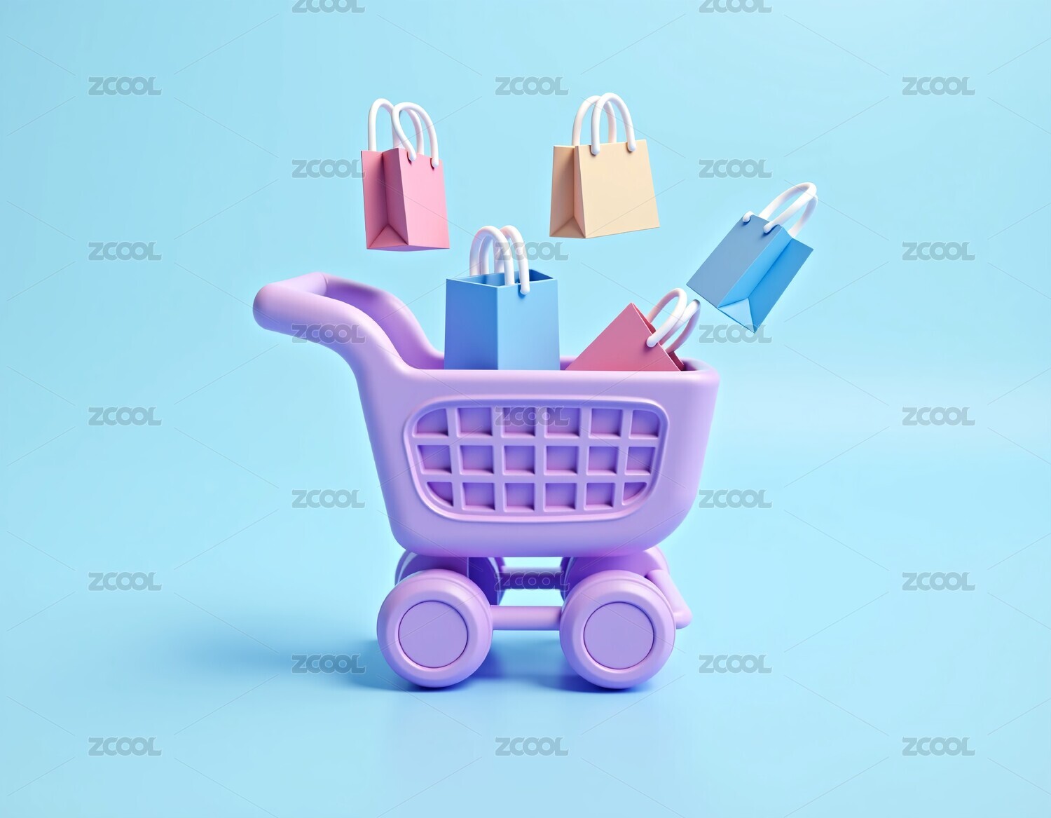 蓝色背景下购物车中的彩色购物袋特写镜头