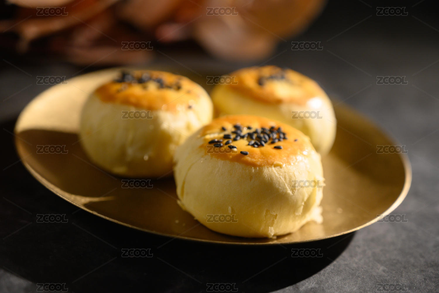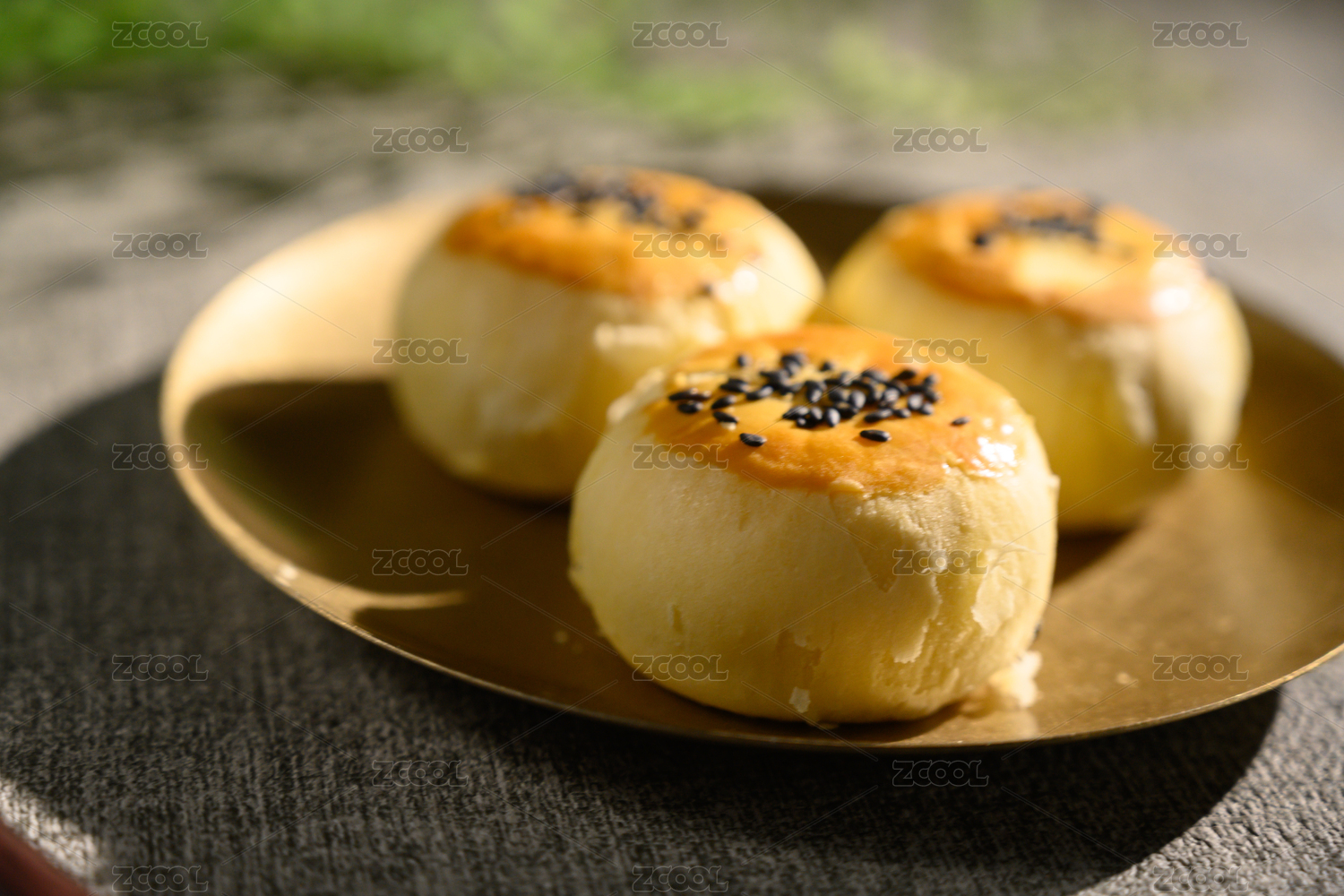 一盘蛋黄酥和茶水摆放在桌面上特写