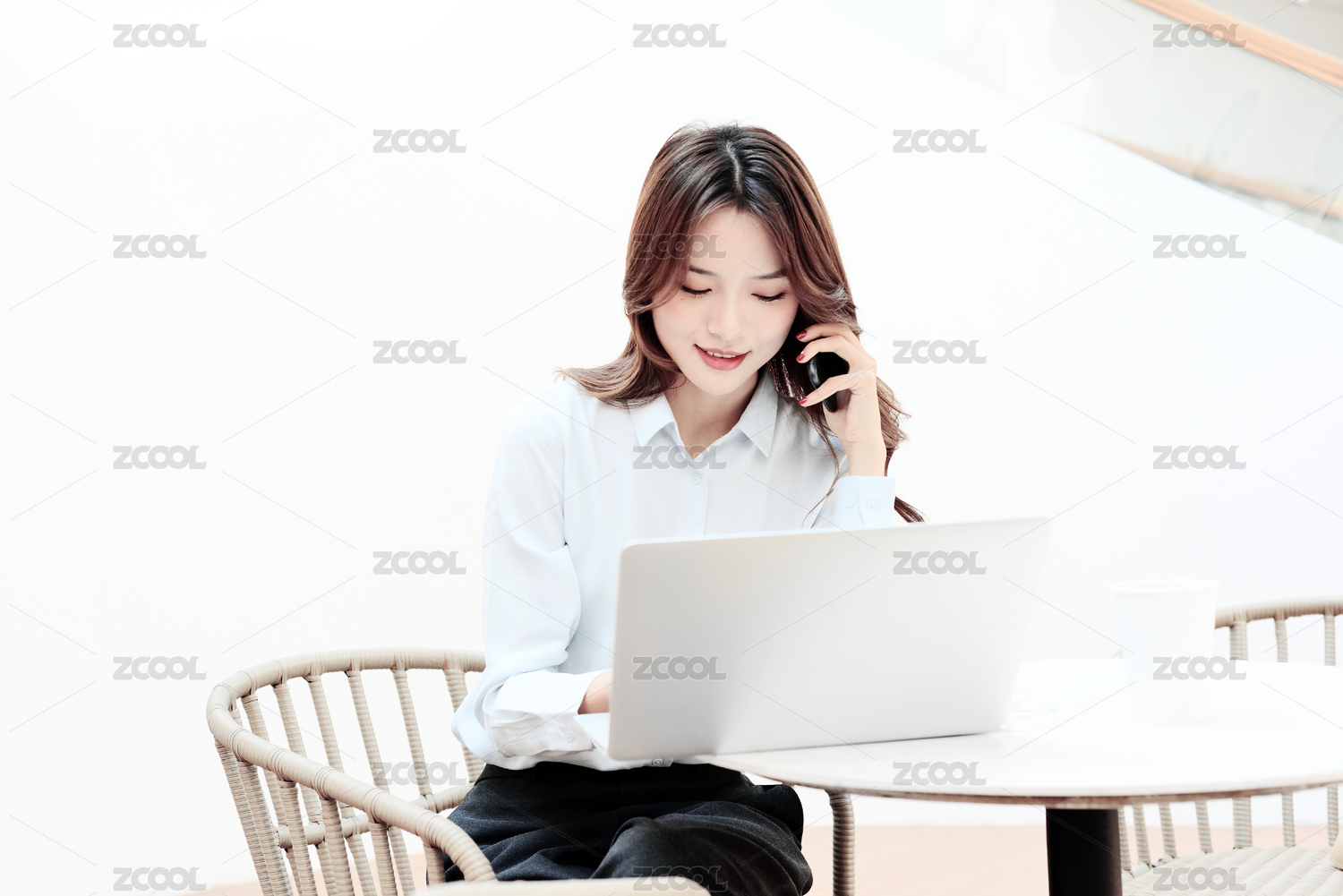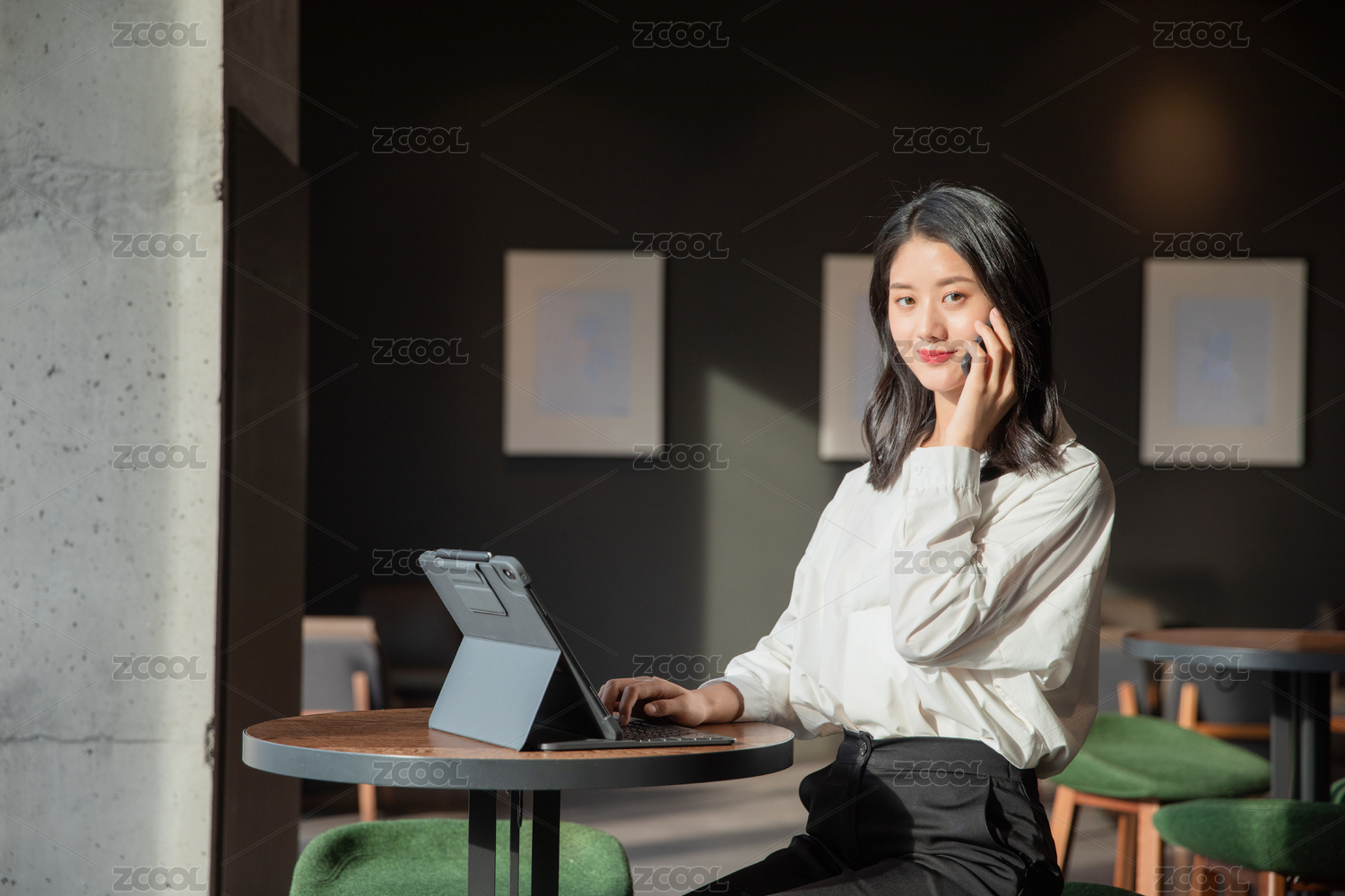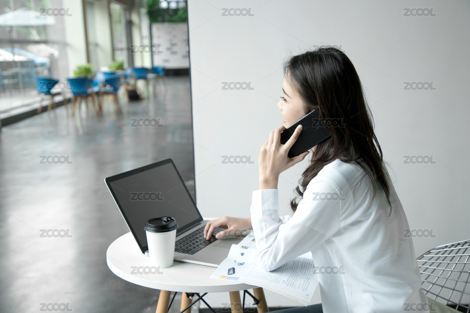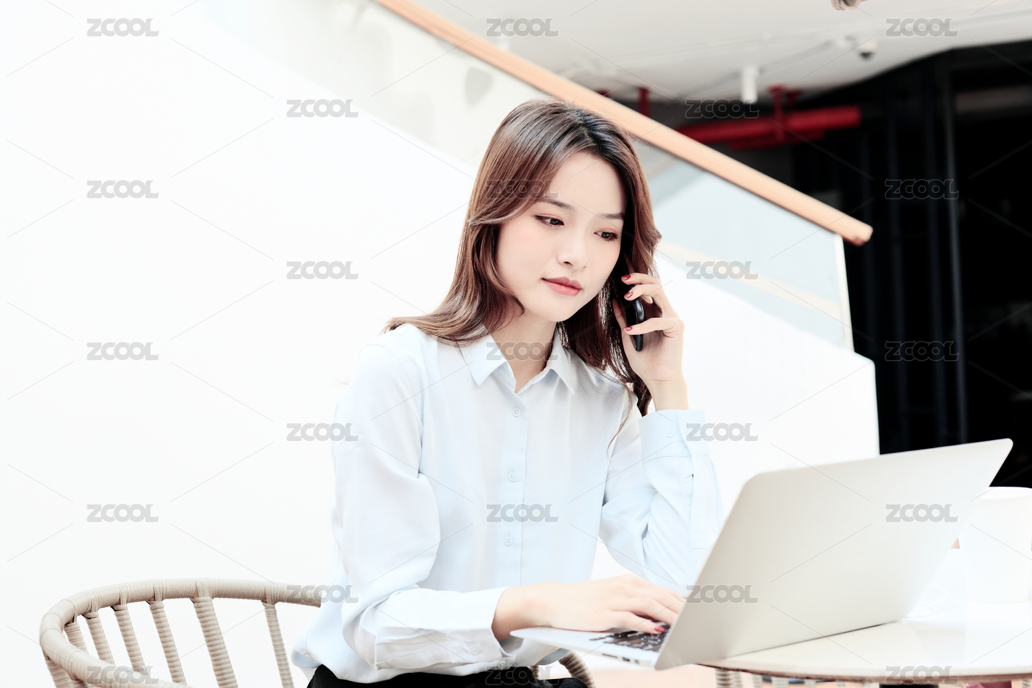 一个中国年轻职业女性坐在平板电脑前用手机打电话