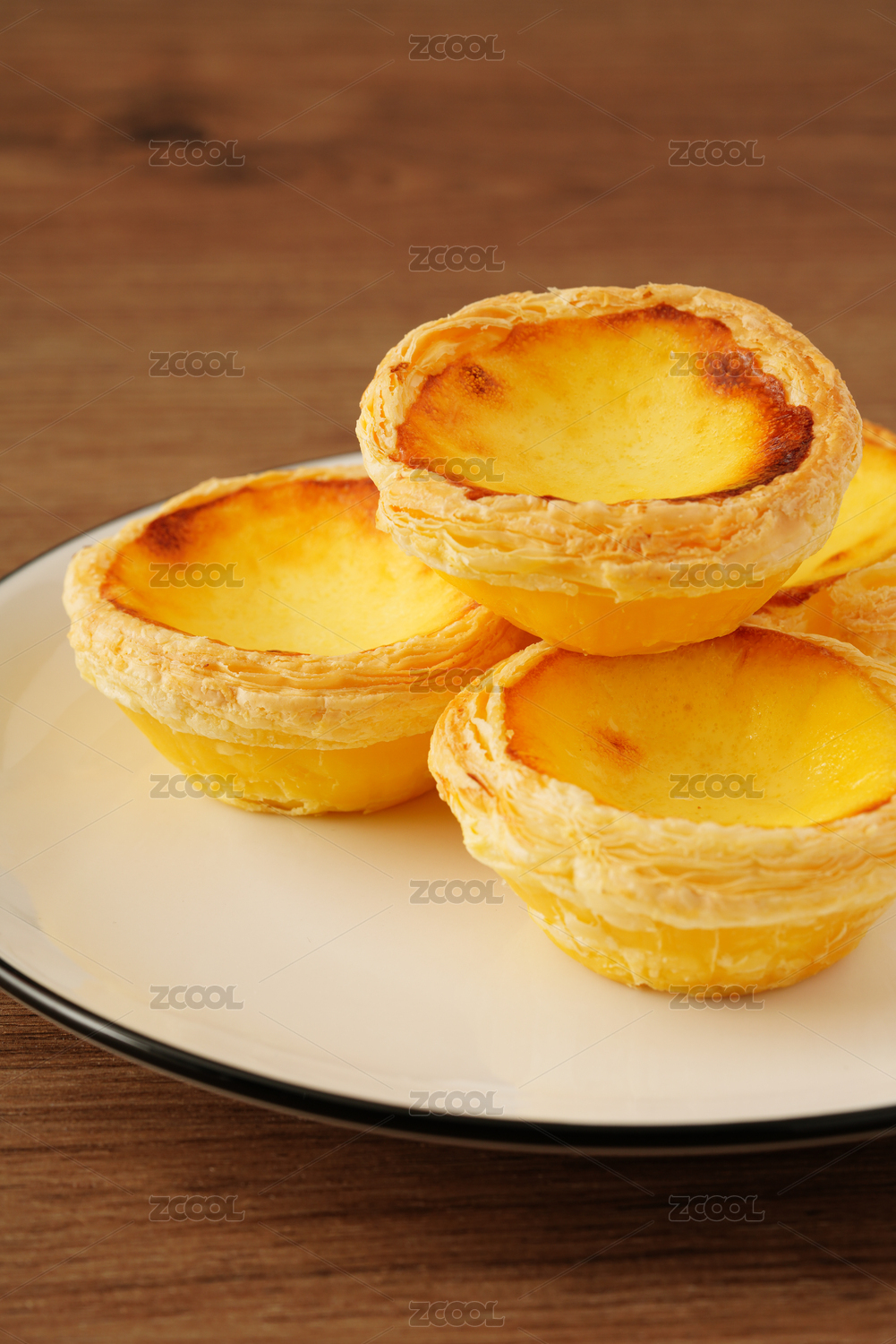 棕色木纹桌面上放着烤熟的蛋挞