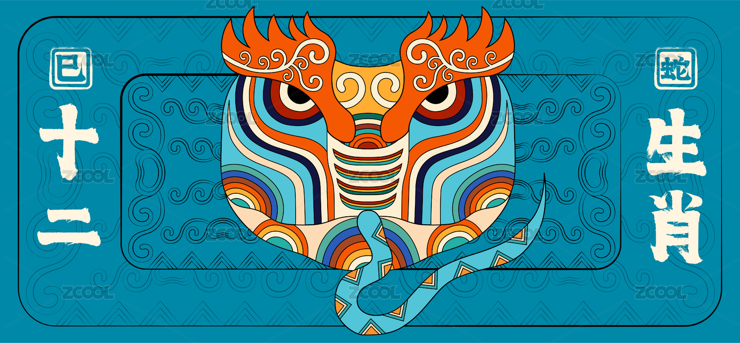 国潮巳蛇十二生肖印花潮流装饰纹样卡通形象