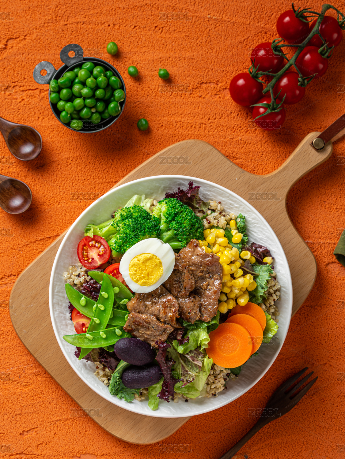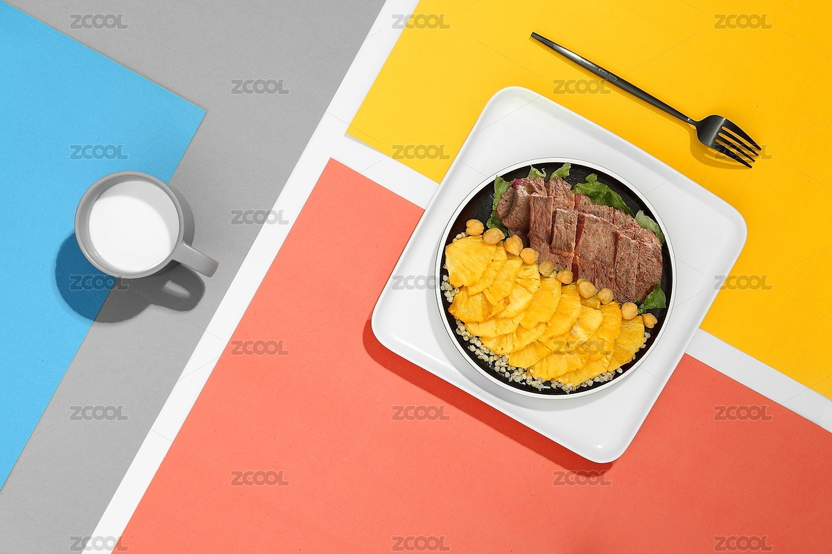 盘子里的健身营养减肥沙拉菠萝牛排沙拉